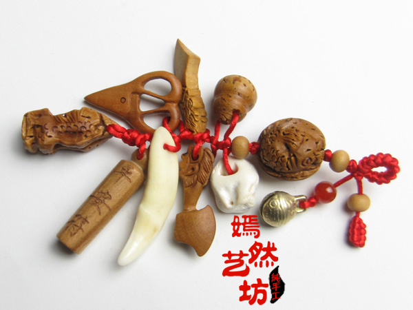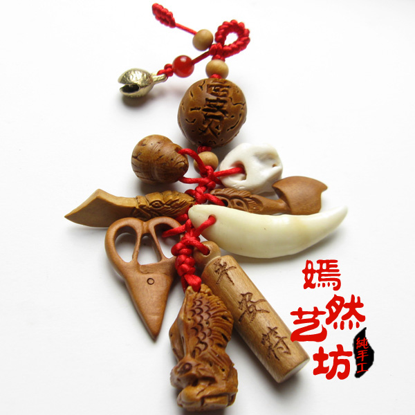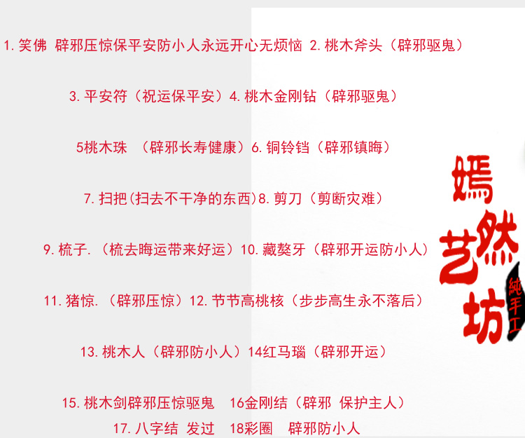 1.桃木劍(辟邪驅鬼)2.桃木斧頭(辟邪驅鬼) 3.平安符(祝運保平安)4.桃木錐(辟邪驅鬼) 5.壽桃 (長壽健康)6.銅鈴鐺(辟邪鎮晦) 7.掃把(掃去不干凈的東西)8.剪刀(剪斷災難) 9.梳子.(梳去晦運)10.藏獒牙(辟邪開運) 11.豬驚.(辟邪壓驚)12.節節高桃核(步步高生) 13.桃木人(辟邪防小人)14紅馬瑙(辟邪開運) 15.生肖桃核(辟邪鎮災)16金剛結(辟邪 保護主人) 【溫馨提示】胎發是辟邪、壓驚的好東西,在我們家鄉大家都會把寶寶滿月后第一次剪的胎發包在一張紅紙里,然后放在紅袋里,讓寶寶隨身攜帶。可以將百無禁忌袋別在寶寶的衣袖上。狗牙等也可以單獨使用給寶寶戴在手腕上,桃木劍可以掛在寶寶衣袖或推車上哦~