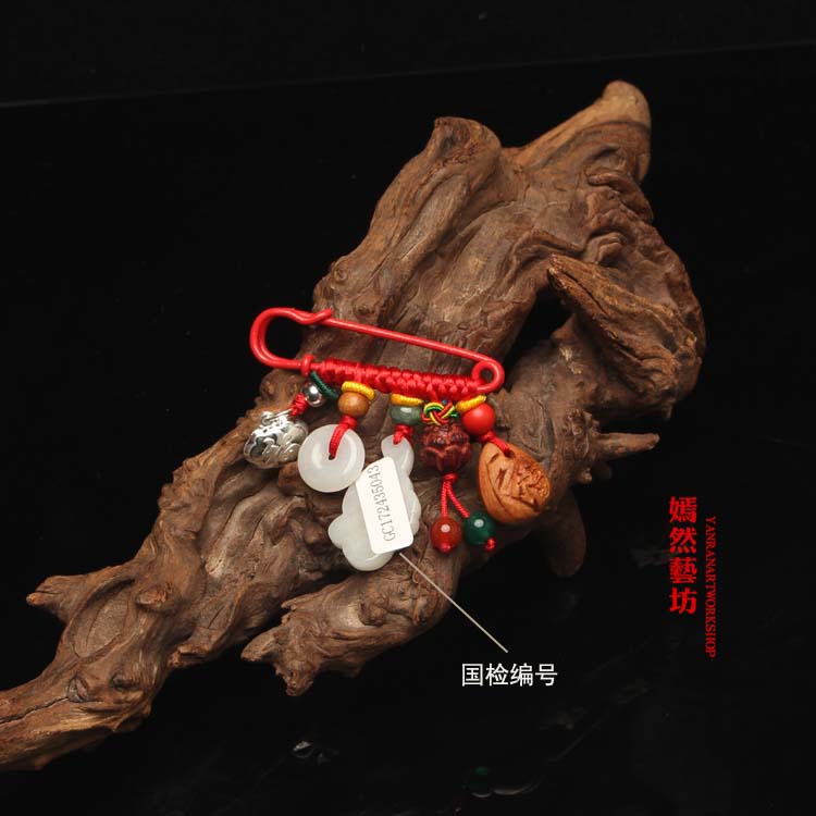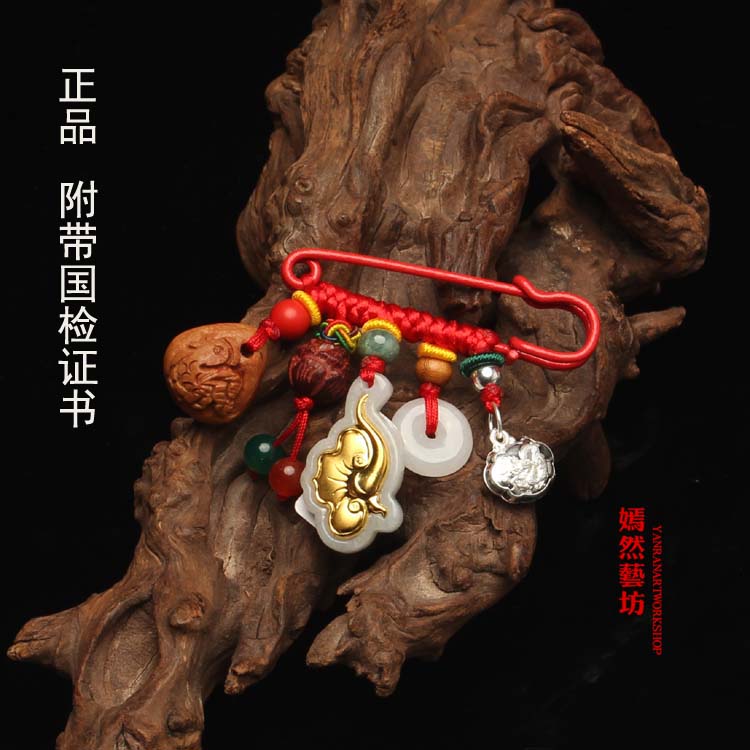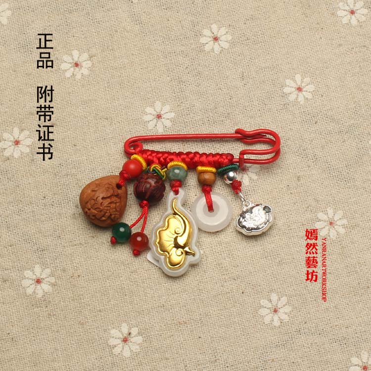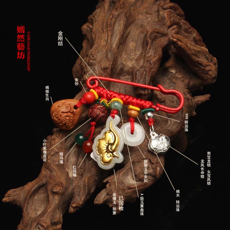 辟邪壓驚安全別針掛件紅色寶寶嬰兒金剛結桃核金鑲玉正品吊墜1入