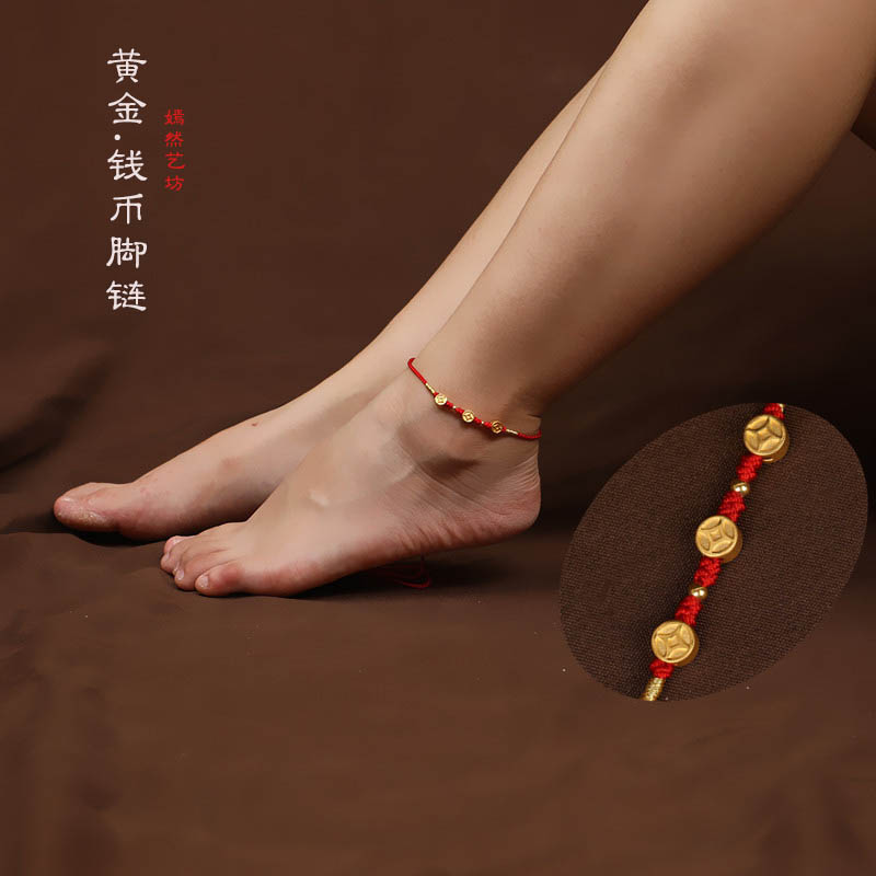 開光999黃金錢幣紅繩腳鏈3D足金轉運珠紅腳繩幸運男女招財化太歲1入