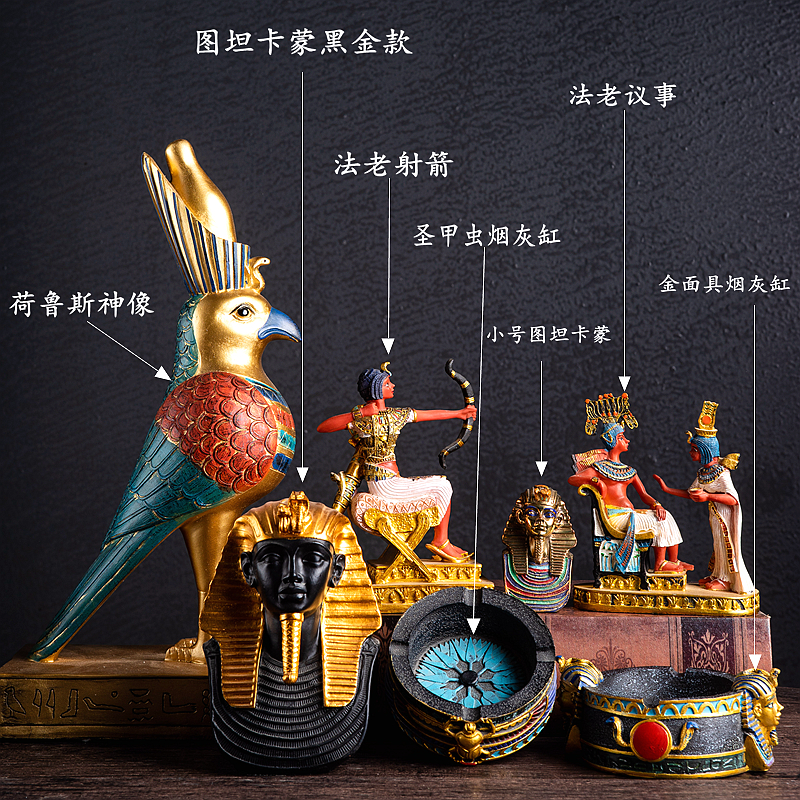 圖坦卡蒙黑金款:10*8*15 小號圖坦卡蒙:4*3*7 法老射箭:12*4*14 法老議事:12*4*12煙灰缸:10*10*5