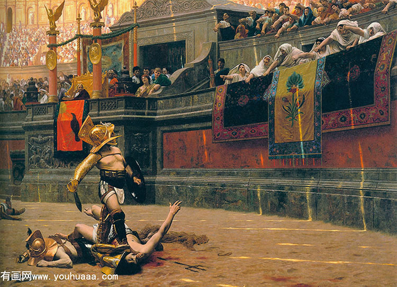 角斗士 對角斗士的最早記載要追溯到公元前264年。當時的角斗士大多是奴隸,被迫在著名的貴族朱尼厄斯·布魯特斯·貝拉的葬禮上拼死搏殺。角斗士是經過訓練的職業殺手,他們常常為了取悅皇帝與地方領主而搏殺到死。在羅馬,共和國時期的的角斗比賽大多由私人資助,而帝國時期角斗比賽則主要在皇室或政府的資助下進行。 由于影視作品的影響,現代人對于角斗士這一職業常有誤解。一些需要澄清的事實包括: