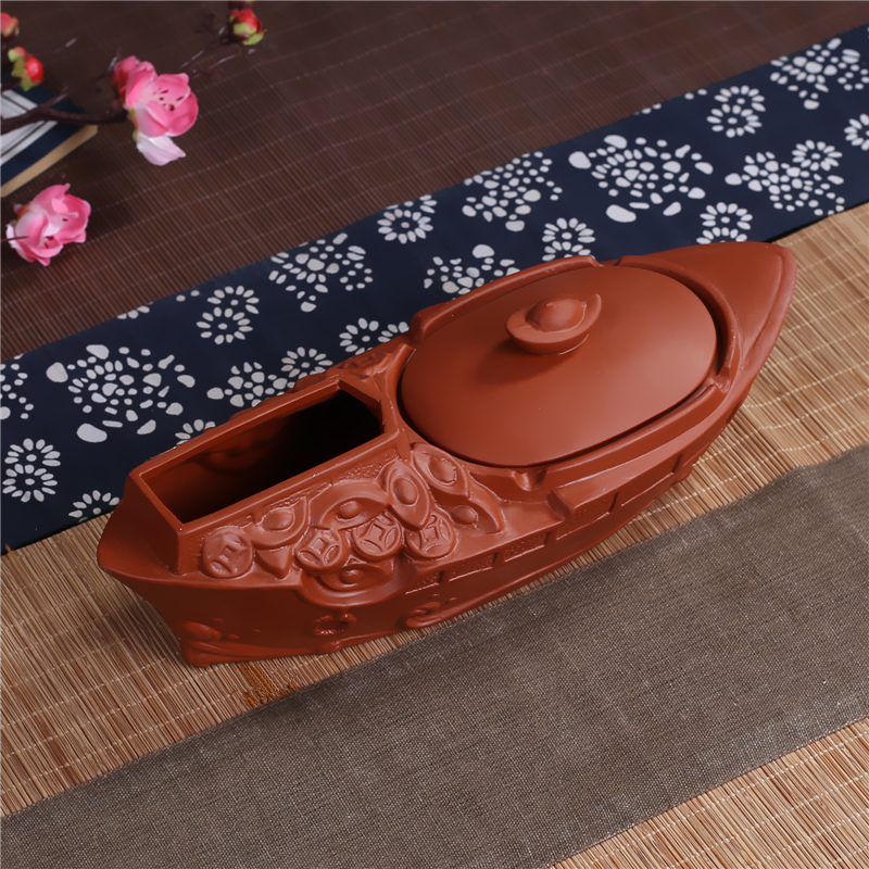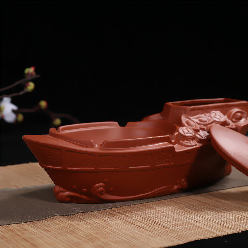 紫砂煙灰缸創意一帆風順紅頭船復古帶蓋大煙缸彈煙缸收納工藝擺件1入