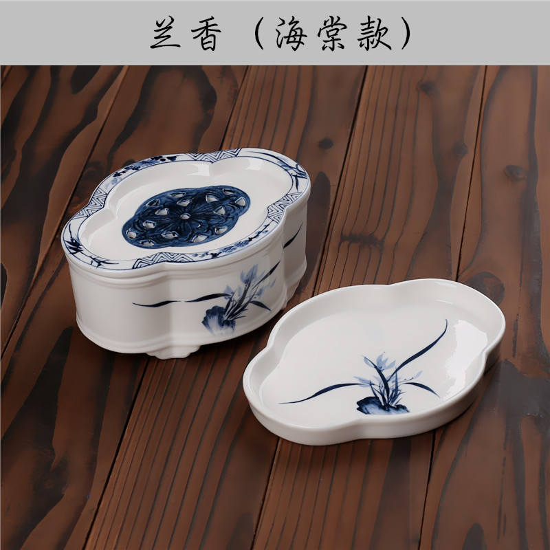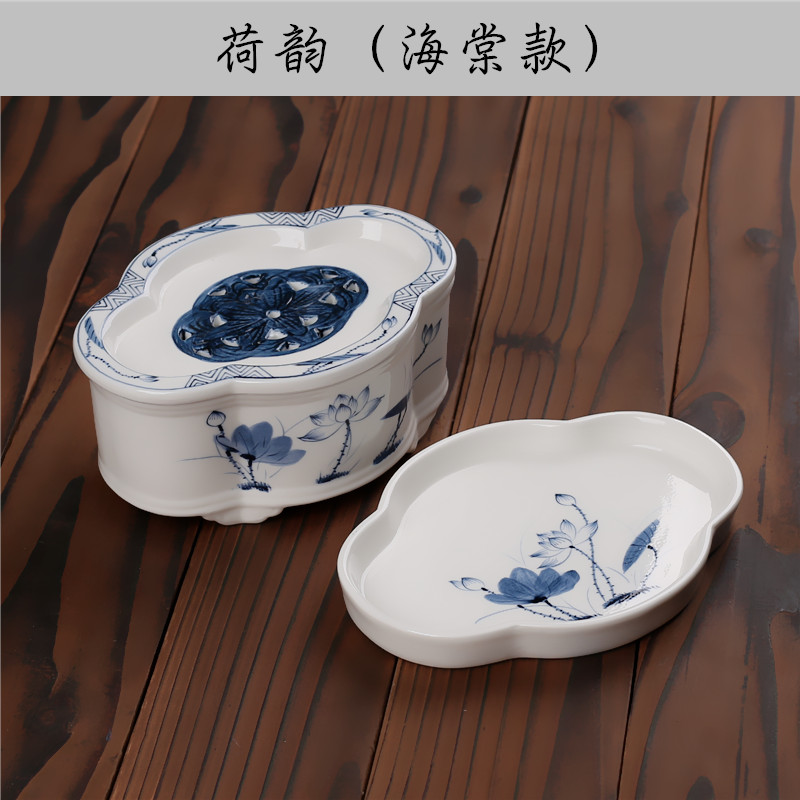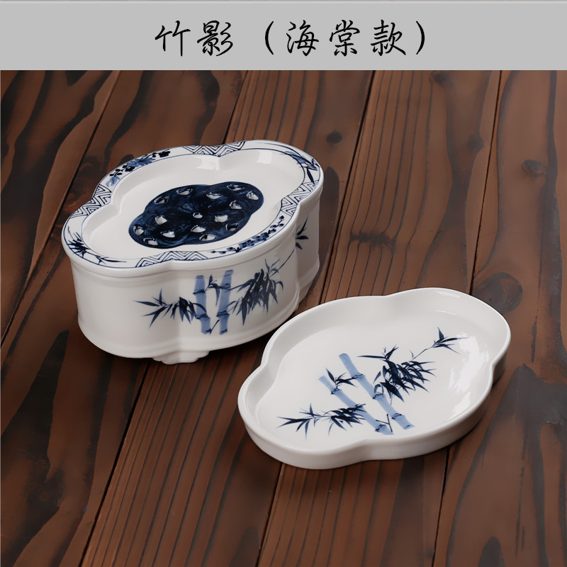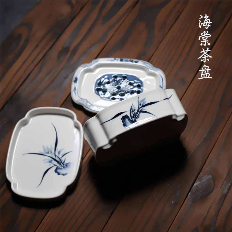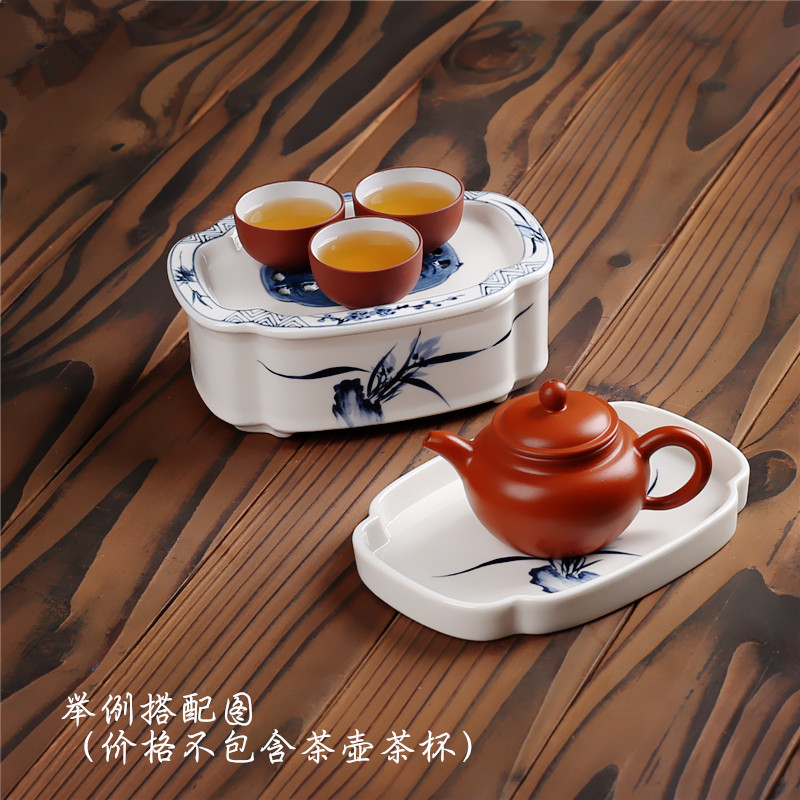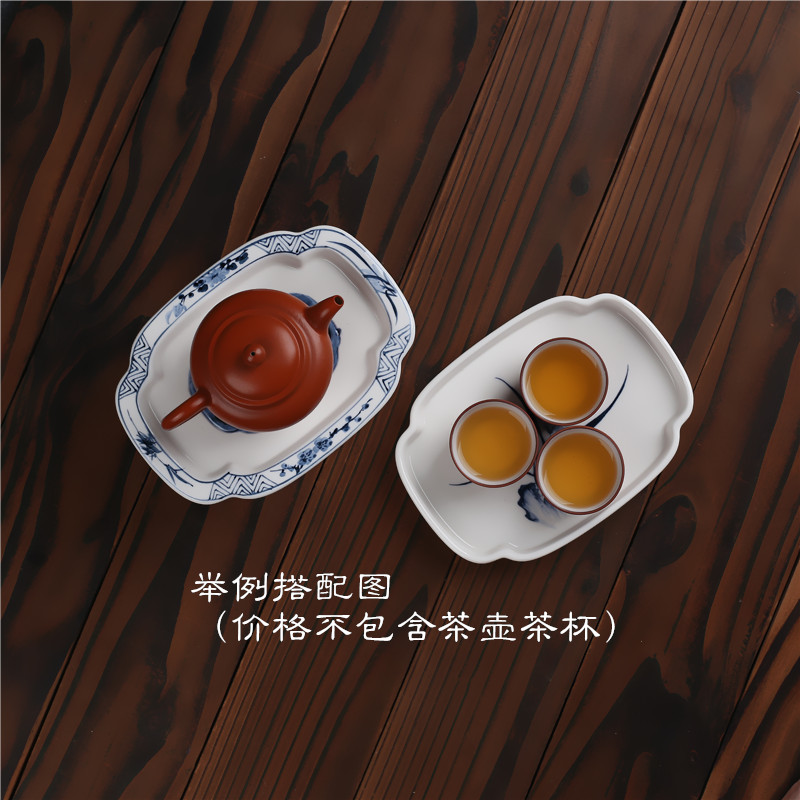 青花手彩茶船干泡臺儲水茶盤全手工陶瓷托盤復古功夫茶具潮汕家用1入