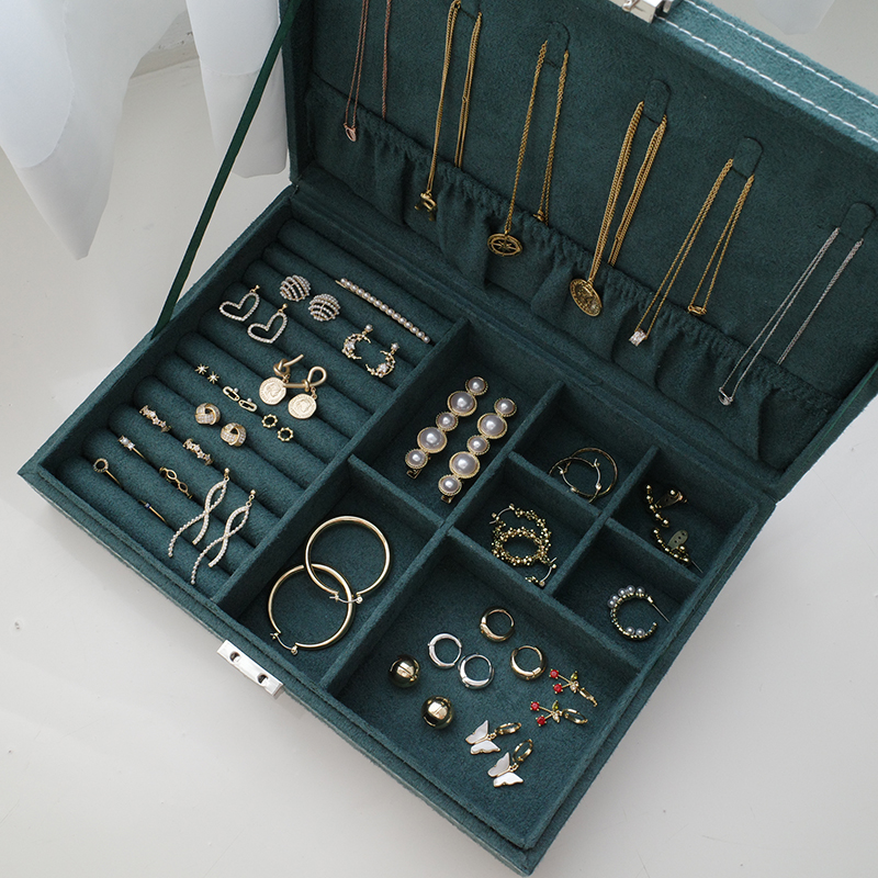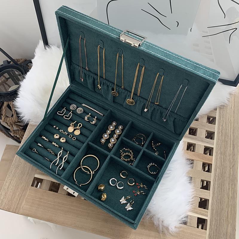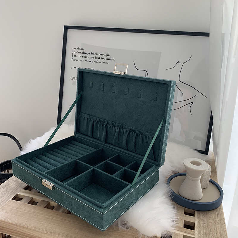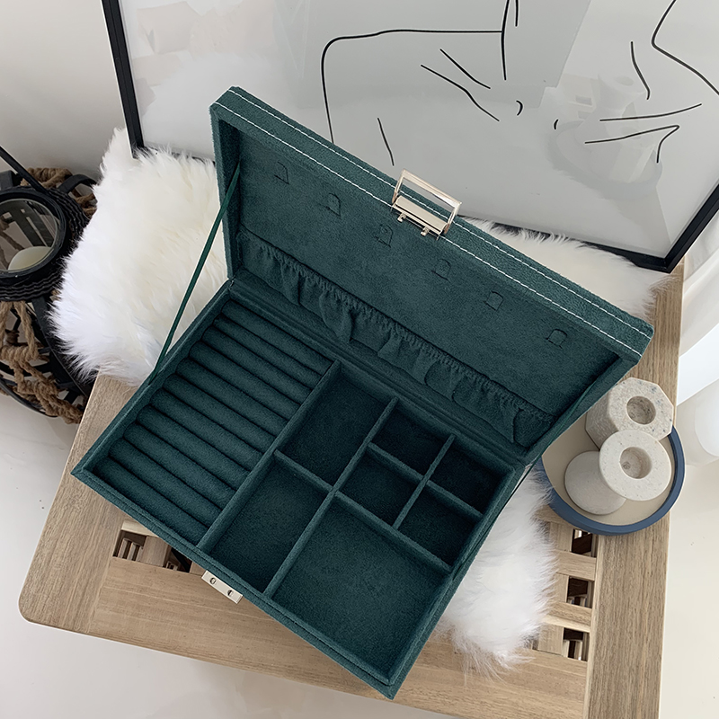 【迷度】復古墨綠麂皮絨布首飾盒 耳飾項鏈首飾收納盒 學生宿舍1入