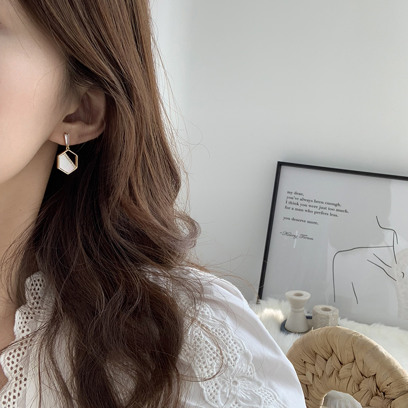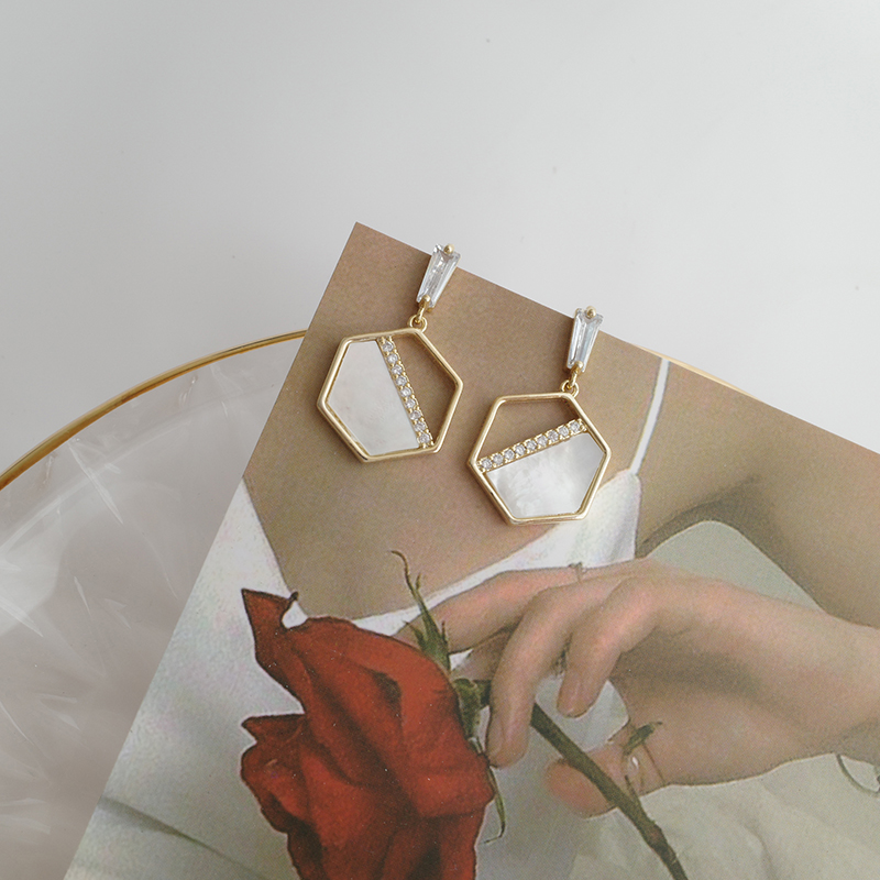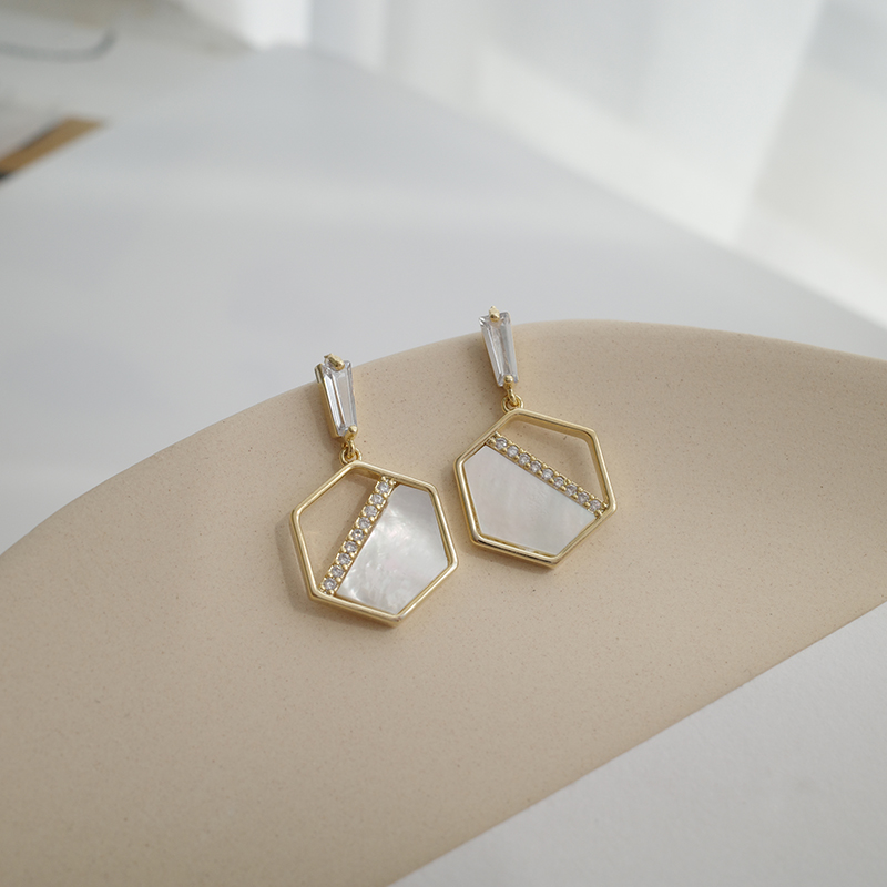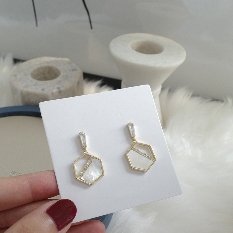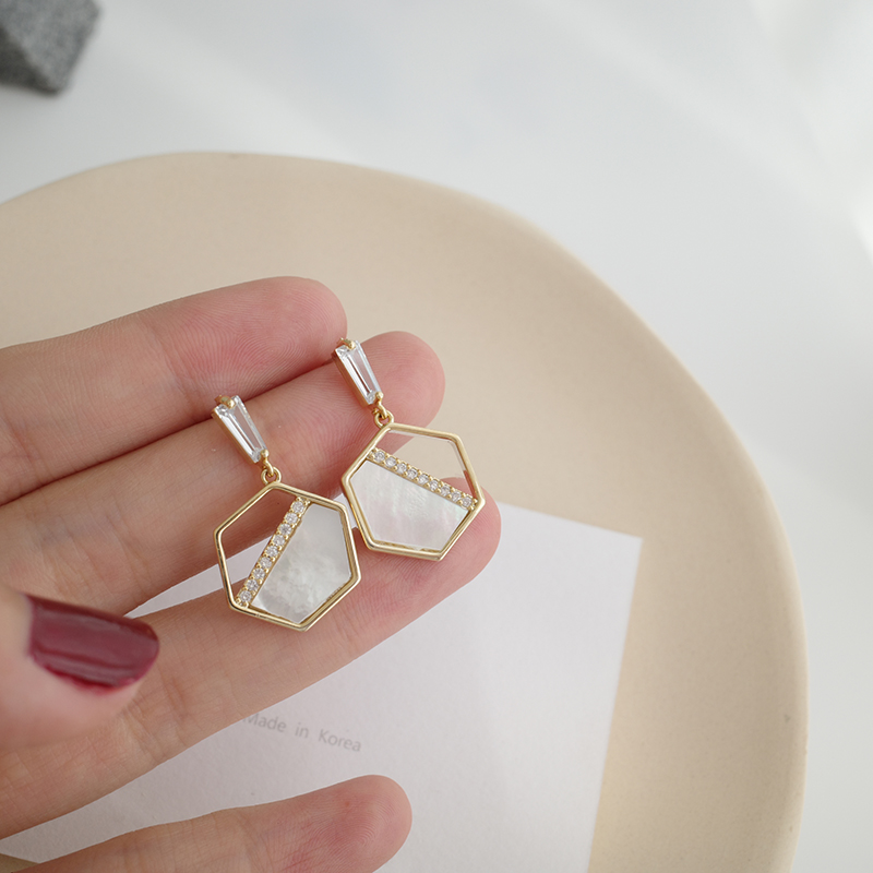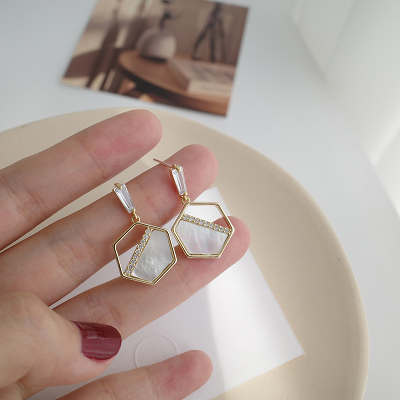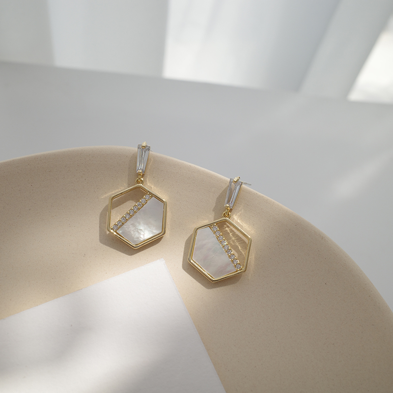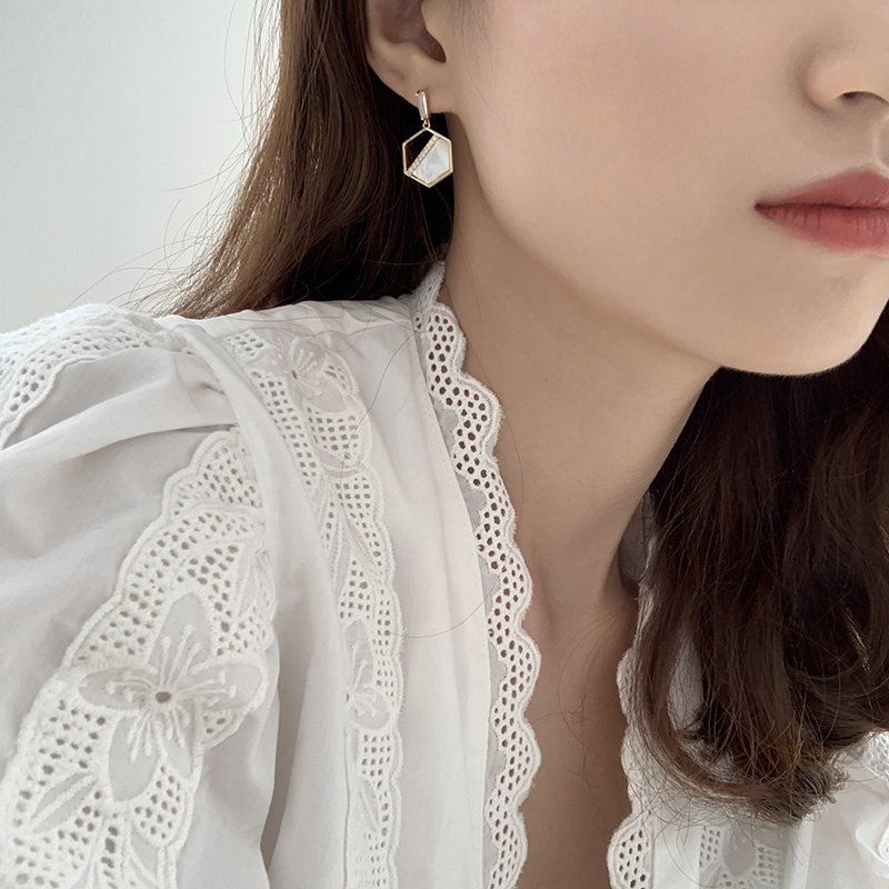 【迷度】S925銀針天然貝殼耳環設計感六邊形耳釘氣質流蘇耳環耳墜1入