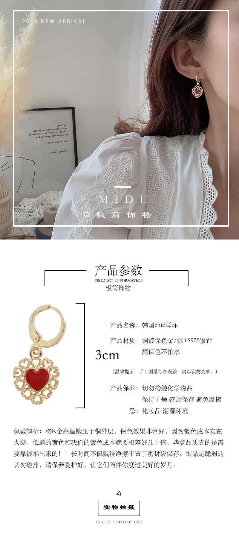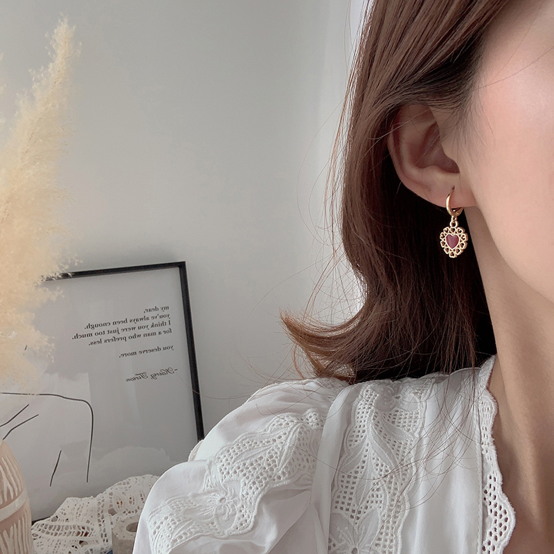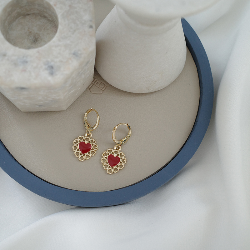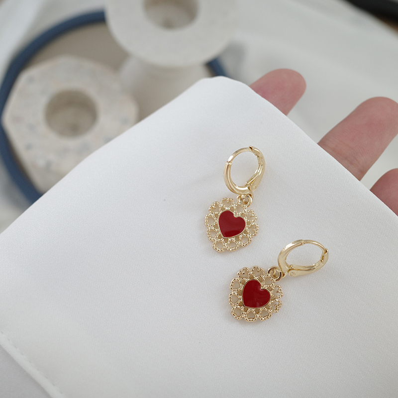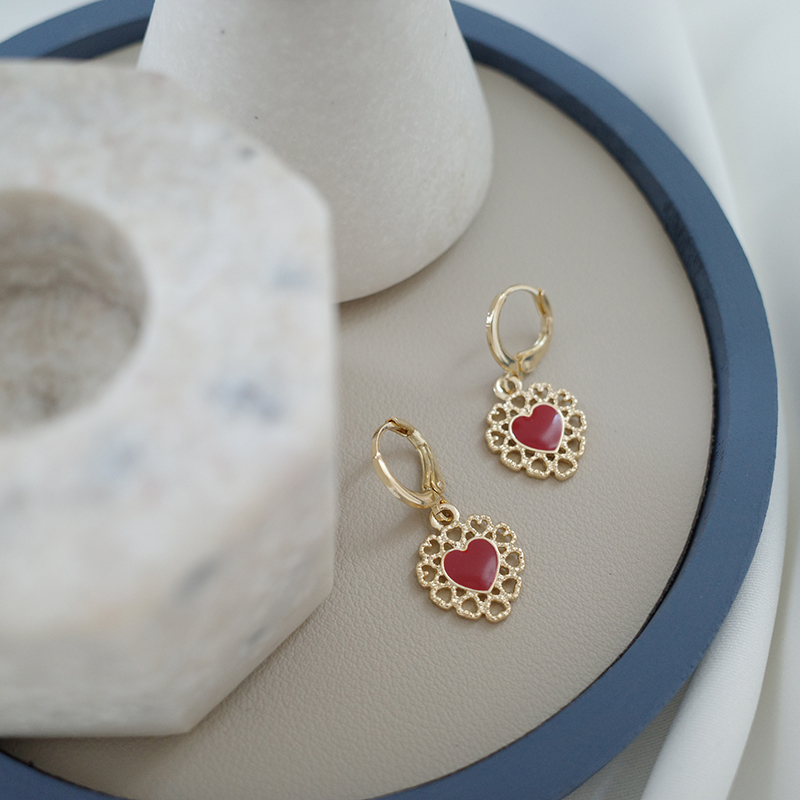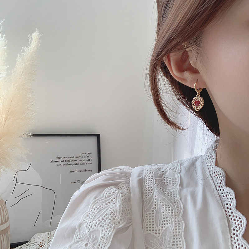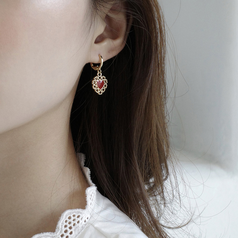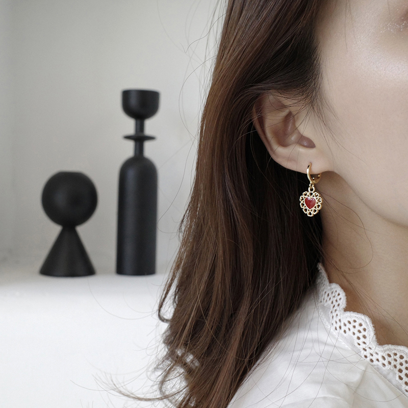 【迷度】氣質復古鏤空蕾絲耳環紅愛心耳扣無耳洞耳夾古風可搭漢服1入