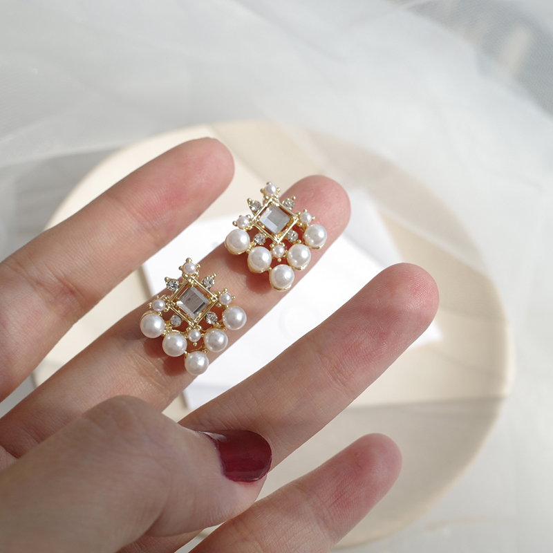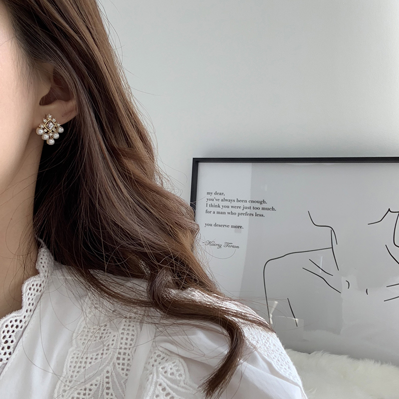 【迷度】S925銀針珍珠耳環溫柔氣質方形鋯鉆耳釘女古風耳墜軟妹1入