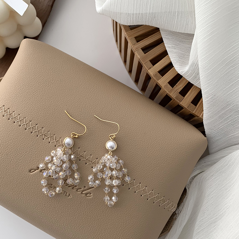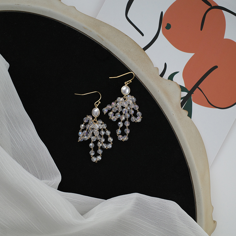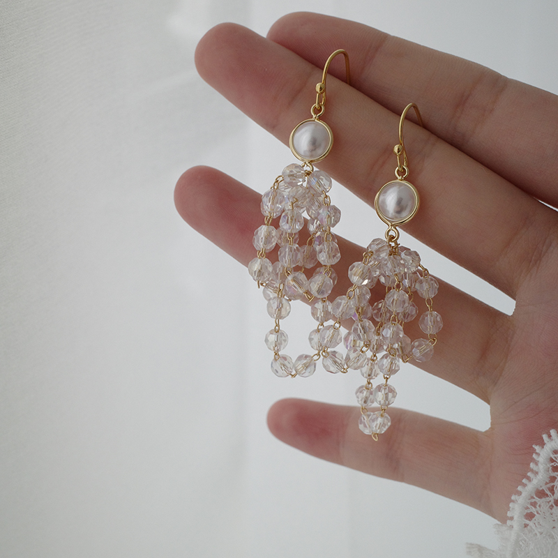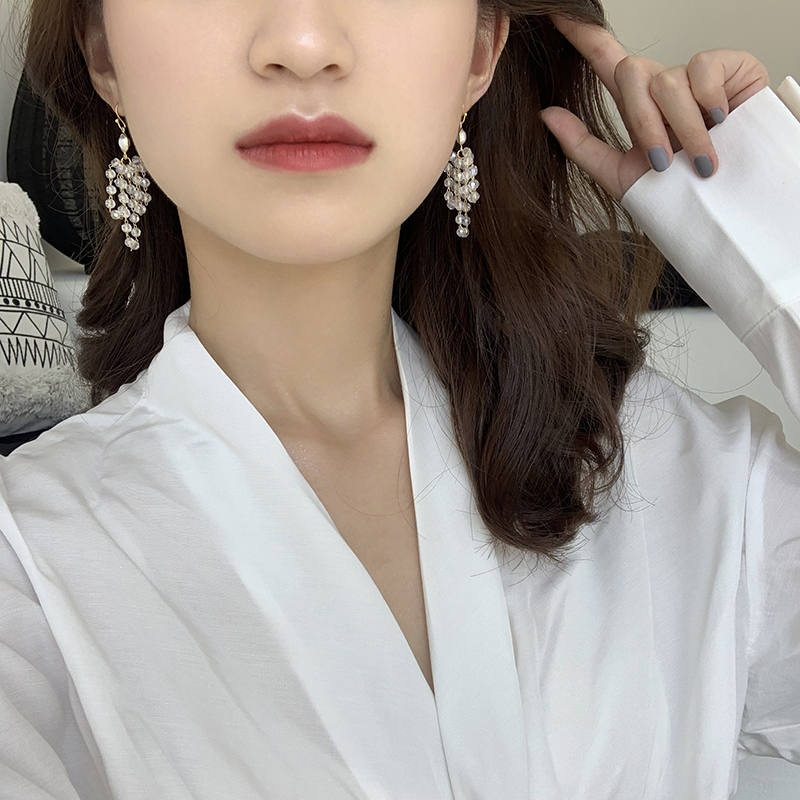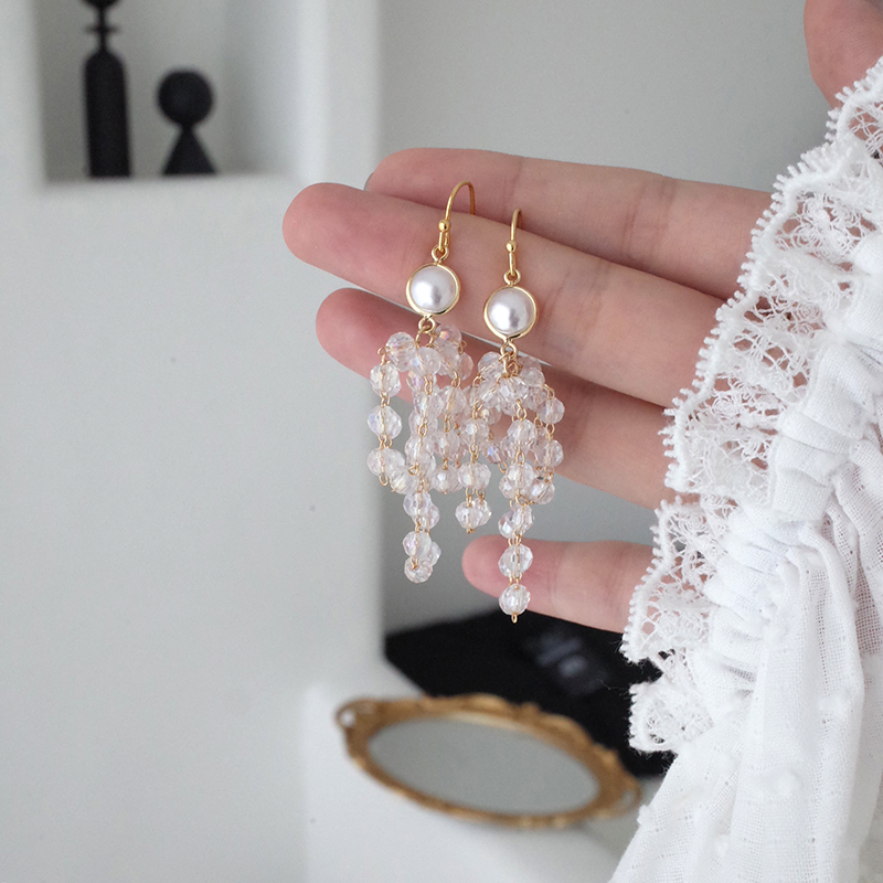 【迷度】珍珠耳環仿水晶耳墜網紅氣質流蘇耳環女超仙顯臉瘦的耳環1入