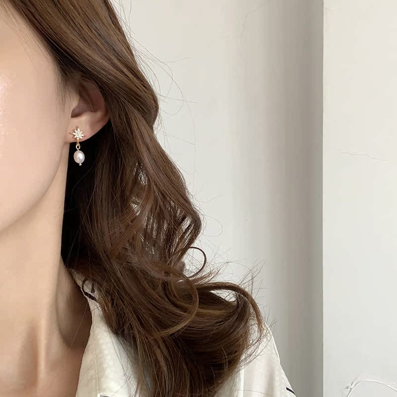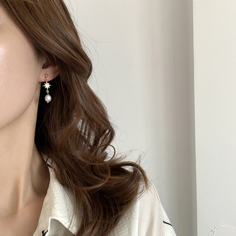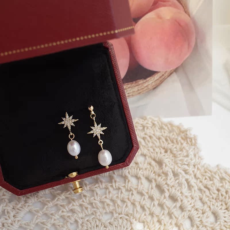 【迷度】S925銀針超閃鋯鉆星星耳釘天然珍珠 高級感耳環法式優雅1入