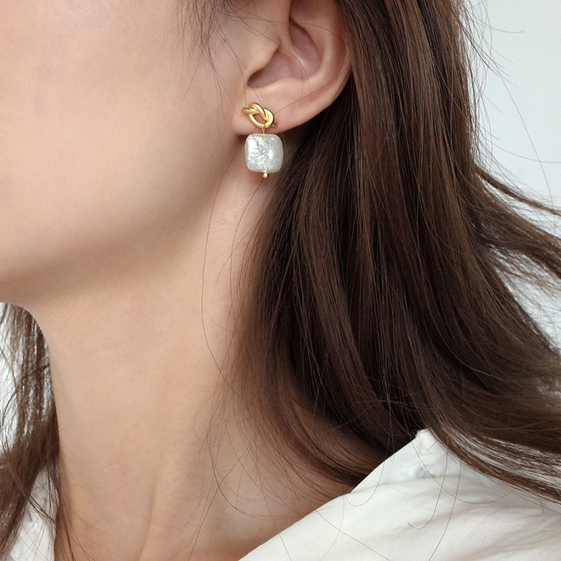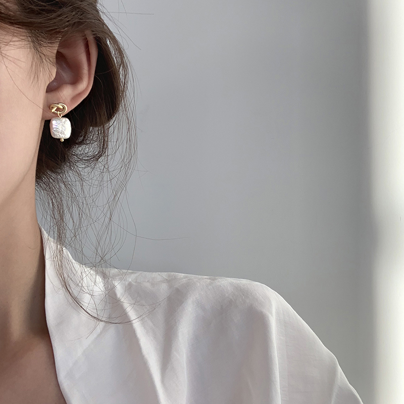 【迷度】S925銀針霧面個性打結耳釘天然珍珠耳環女 設計感耳環1入