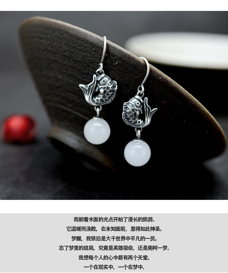 魚兒 原創新款天然白玉純銀耳環女復古文藝手工雕刻耳墜925首飾品1入