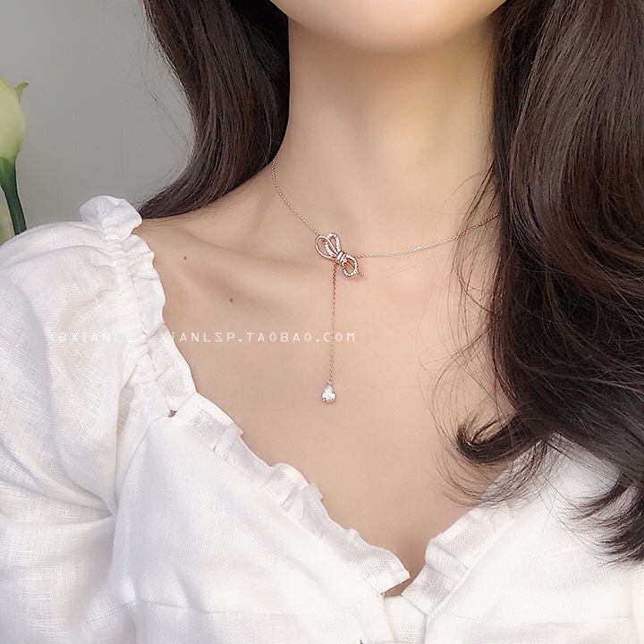 2019新款蝴蝶結流蘇女項鏈短款鎖骨鏈潮氣質網紅水晶脖頸鏈玫瑰金1入