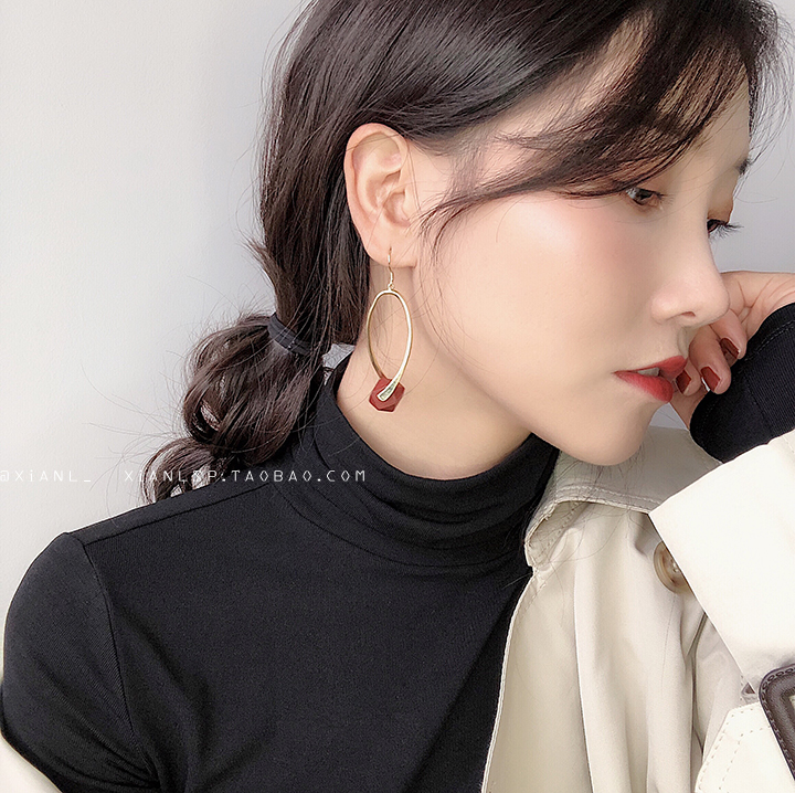 2019新款簡約風安娜網紅同款復古紅色幾何木頭質感耳環耳鉤女耳墜1入