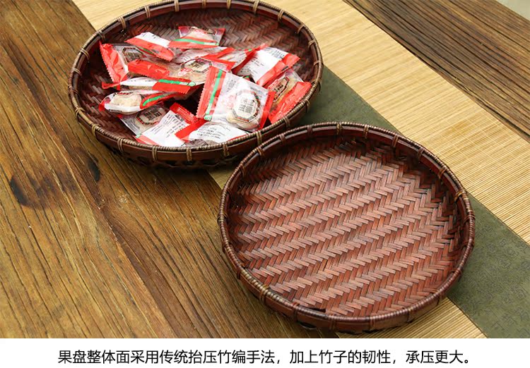 竹編仿古做舊果盤圓形果盤收納盒擇藤茶具茶具收納水果盤堅果盤1入