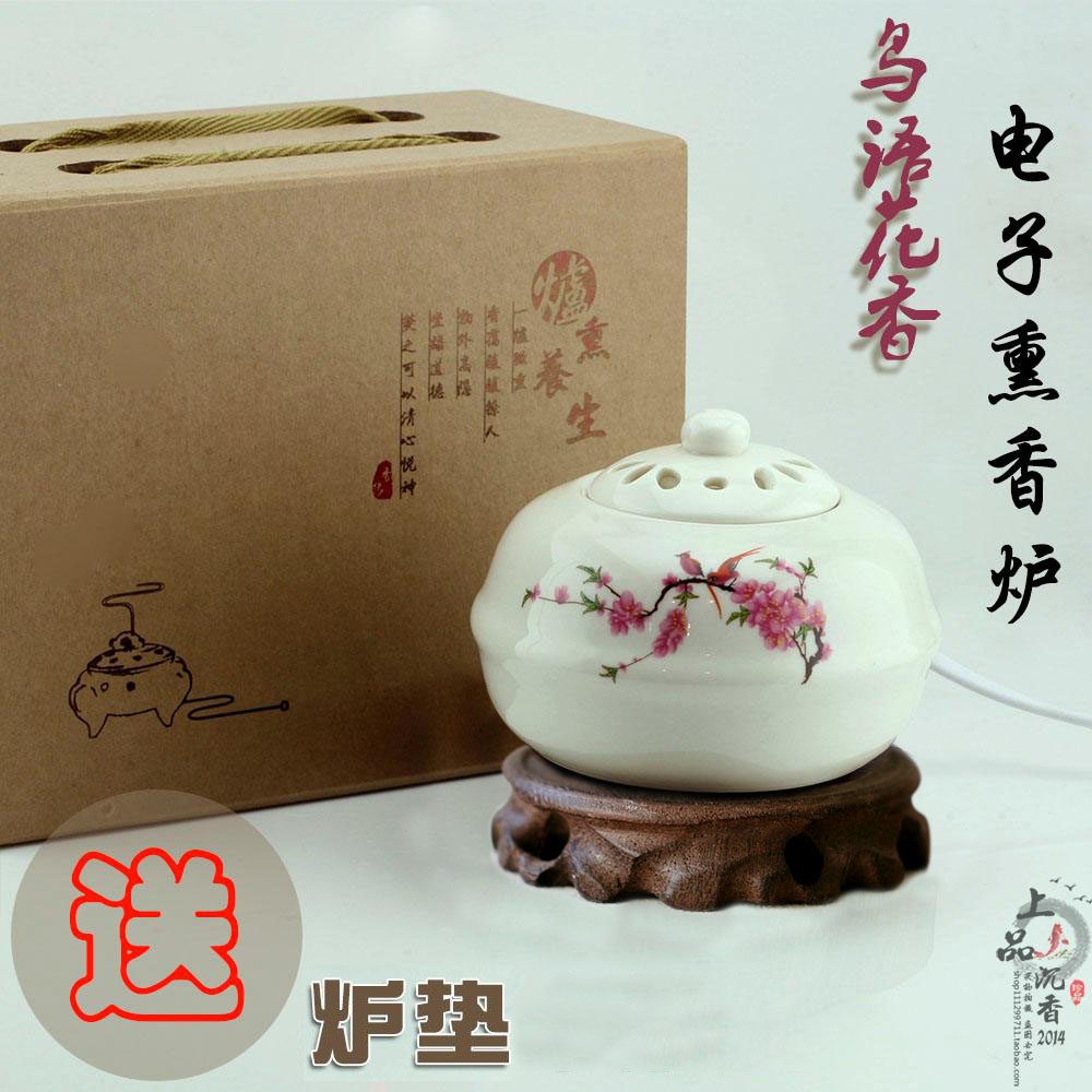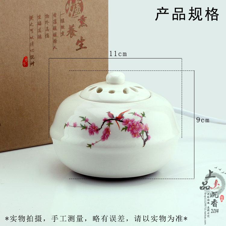 【名稱】:調溫電子香熏爐【材質】:陶瓷【顏色】:鳥語花香【適用范圍】:香薰精油,檀香粉,沉香粉,木屑,碎木塊【尺寸規格】:Φ110mm,含蓋高度90mm【溫度范圍】:50℃—260℃【產品優勢】:本產品是臺灣工藝,大陸生產,屬景德鎮瓷器,安全性能好。