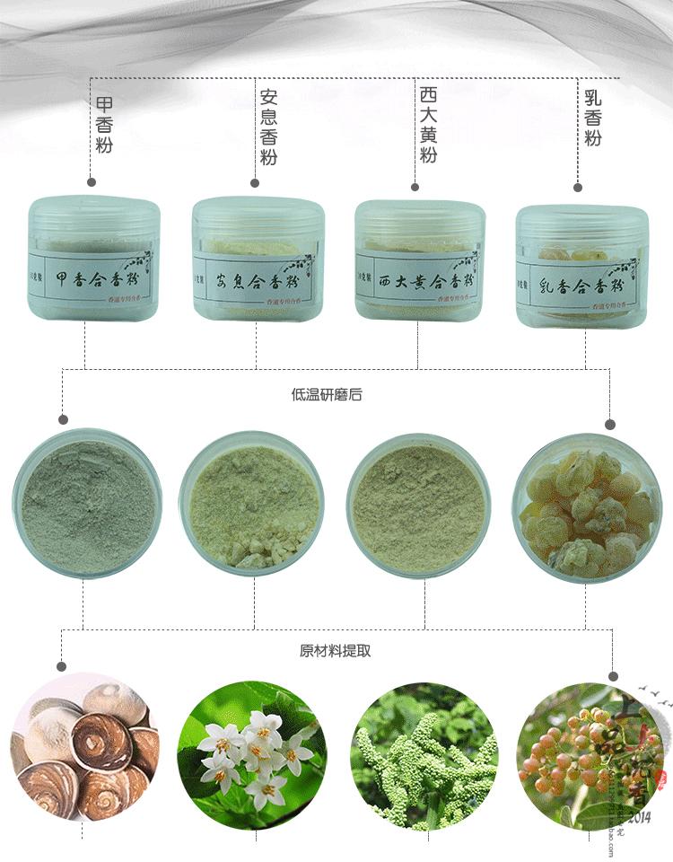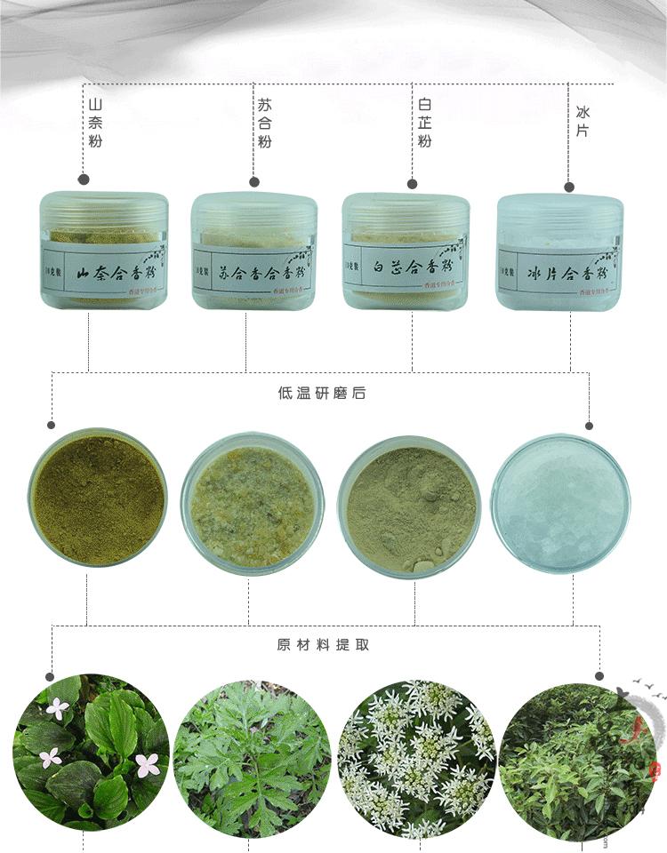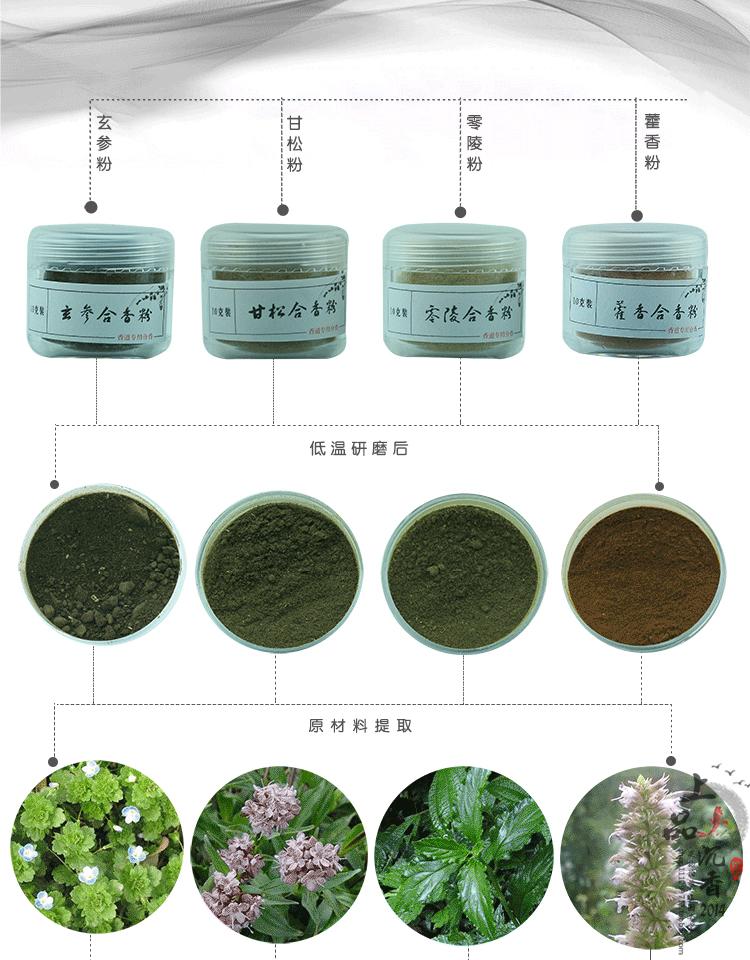 藿香、玄參、小茴香、蒼術、甘松、山奈、乳香、安息香、蘇合香、冰片、甲香、西大黃、零陵、木香、香附、白芷各10克
