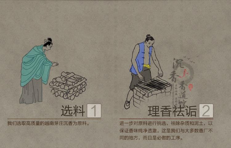 線香制作主要流程: 1.選料:嚴格按標準選材,確保料好香好。 2.磨粉:經過嚴密機器研磨加工成粉。 3.攪拌:根據各種原料的特性,研制出合適比例的香品,確保上乘品質。 4.醇化沉香:在特定的溫度和濕度作用下,慢慢醇化,使其香味更加的自然 醇厚。 5.制香:把攪拌好的粉,擠壓成條或成型,盤香需由輸送帶用手工盤圓。 6.曬香:把制作好的香品放太陽底下晾曬。 7.窯藏:很好的發酵工藝的制香技術,是品味的關鍵。 8.包裝:精細檢查香,并將其包裝成品。