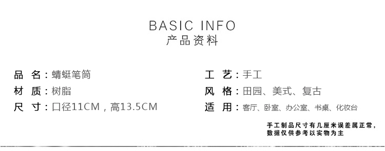 【材質】:環保樹脂 【組成】:單品 【包裝】:環保牛皮紙盒+泡沫防護模 【尺寸】:直徑11CM 高13.5CM 【推薦】:一款極簡的北歐筆筒,很適合辦公,書房書柜或隔板上裝飾,小口有招財鎮宅之意。非常別致的一款家居裝飾品,也適合店面及辦公空間的裝飾。不論是送人或者自用都非常不錯哦! 溫馨提示: 1.如產品收到有破損,請在簽收時起24小時內拍下產品整體包裝圖片和破損細節圖,聯系我們在線客服,以便盡快進行索賠和補發,謝謝您的耐心配合。 2.本店圖片均為實拍效果,無后期修飾。因燈光及顯示器問題。顏色以實物為準! 3.產品尺寸均為手工測量,因測量方式不同,或存在2-3cm左右誤差!請悉知! 【溫馨提示】:這款產品是做舊仿古效果會有細微差異導致顏色深淺也會有些許差異(手工制品實屬難免),善意提醒。蜻蜓筆筒內側顏色和外表顏色一樣的哦!