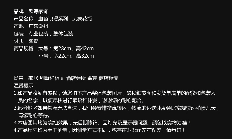 品牌:歐粵家飾 產品名稱:宮廷系列--大象花瓶 產地:廣東潮州 包裝:專業包裝,整體包裝 材質:陶瓷 尺寸:小號:寬22cm、高32cm 大號:寬28cm、高42cm 場景:家居 別墅樣板間 酒店會所 婚宴 商店櫥窗 溫馨提示: 1.如產品收到有破損,請您拍下產品整體包裝圖片,破損細節圖和發貨單底單的配貨和包裝人 員的名字,以便盡快進行索賠和補發,謝謝您的耐心配合。 2.部分地區如果物流無法直達,我們會安排物流轉運,物流的運送速度會比常規快遞稍慢幾天, 請您耐心等待。 3.本店圖片均為實拍效果,無后期修飾。因燈光及顯示器問題。顏色以實物為準! 4.產品尺寸均為手工測量,因測量方式不同,或存在2-3cm左右誤差!請悉知!