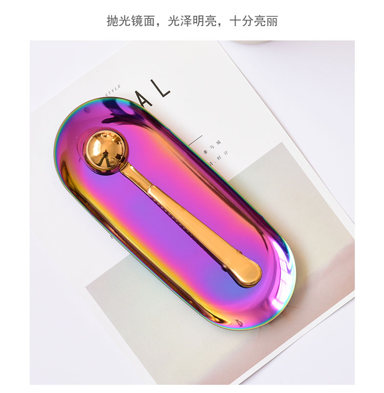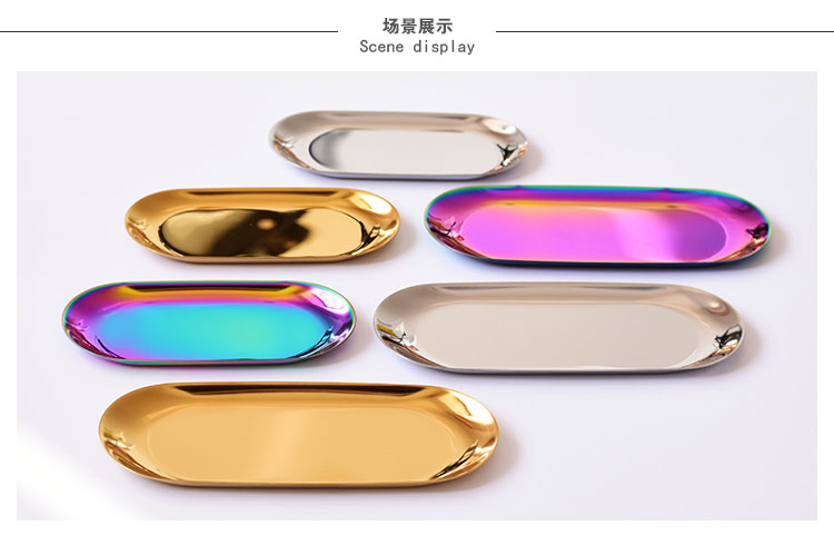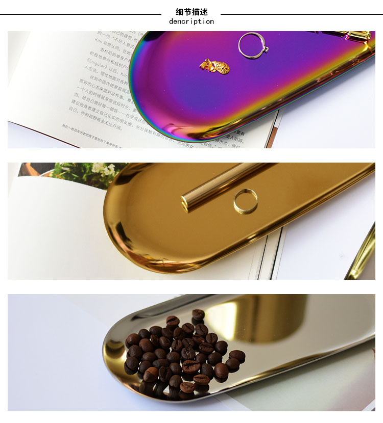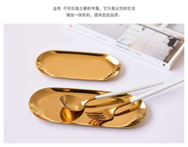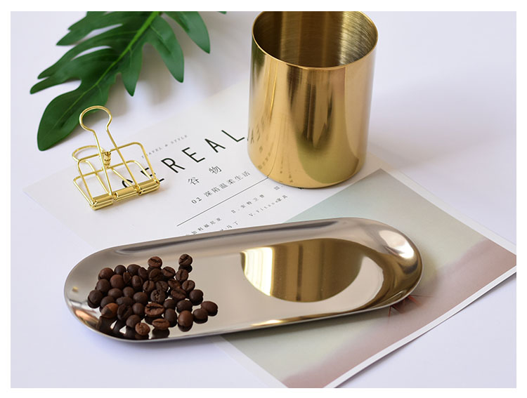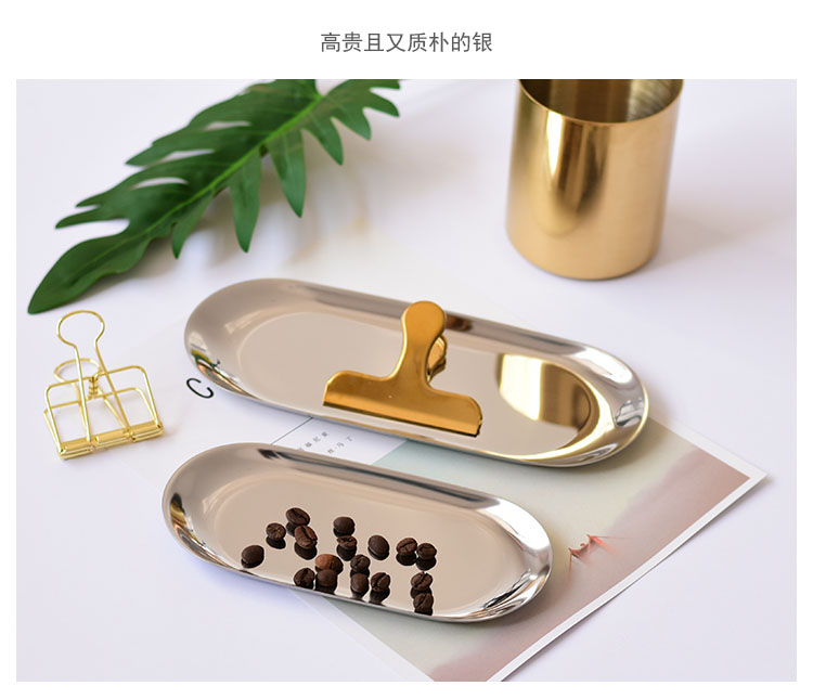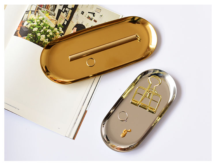 北歐風格金色收納盤金屬長圓形托盤首飾美妝置物水果茶盤銅色擺件1入