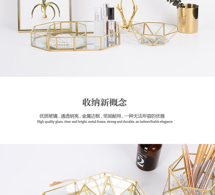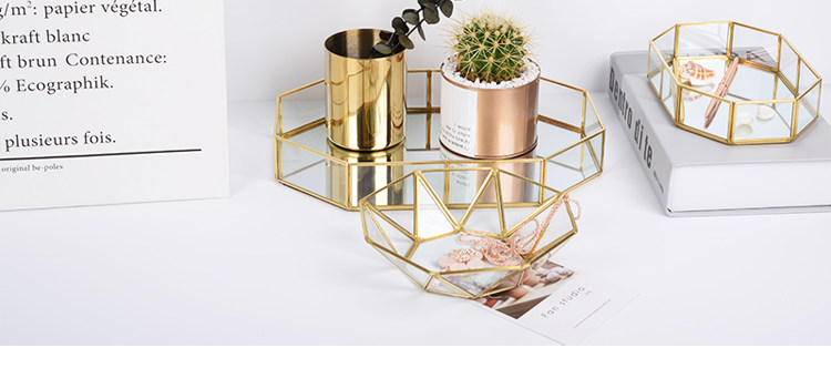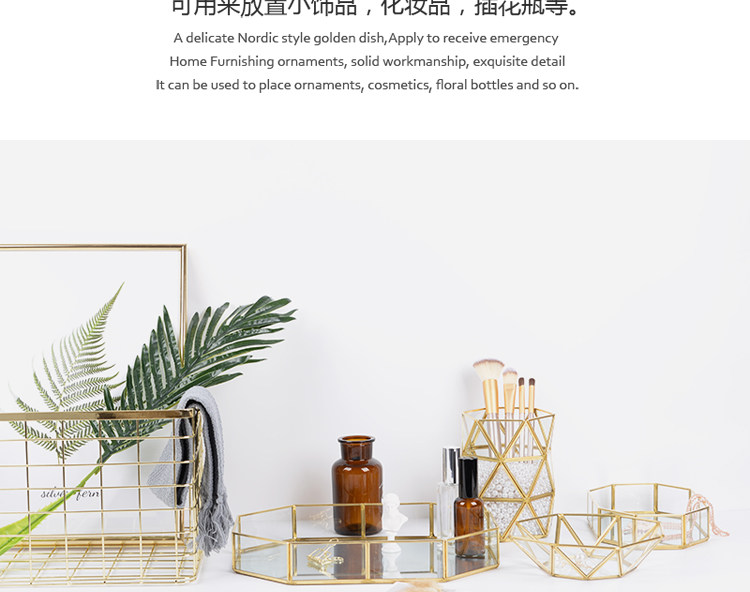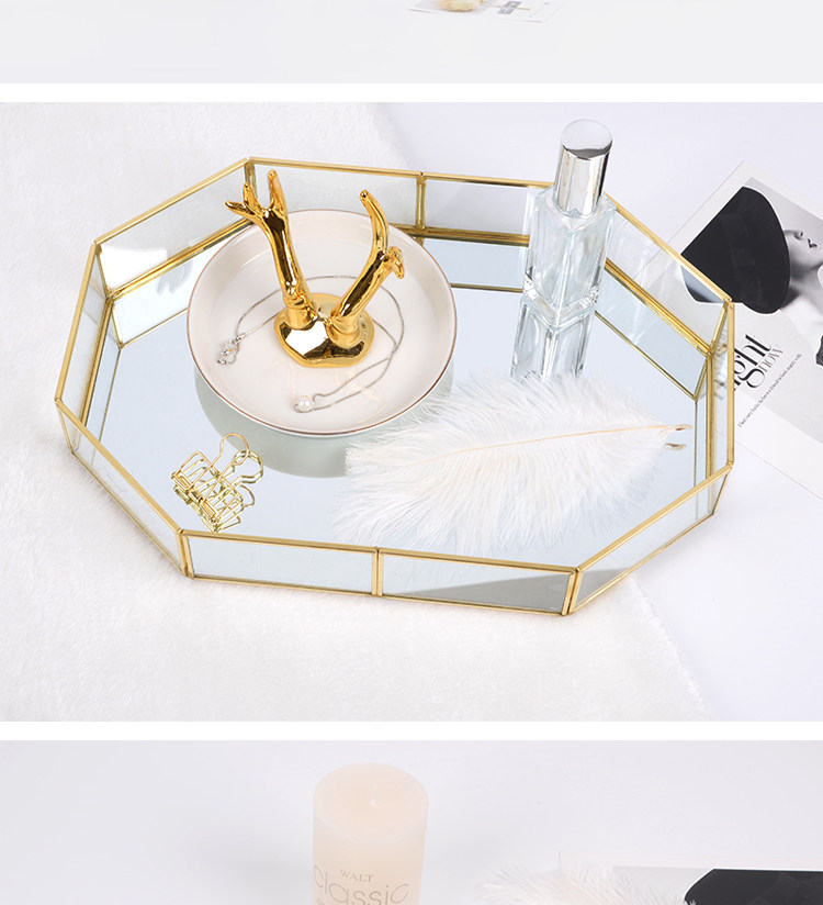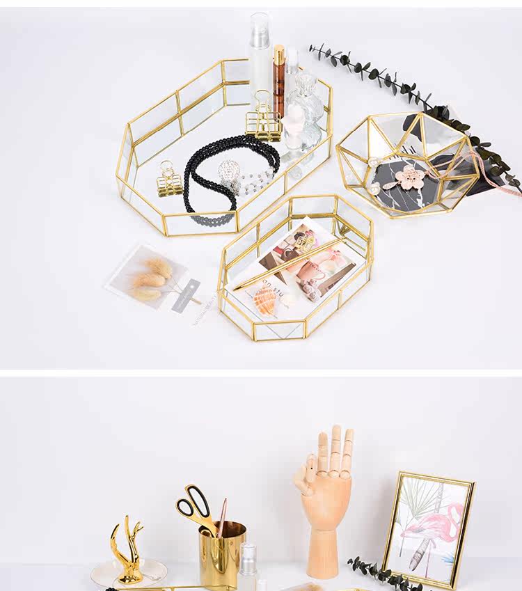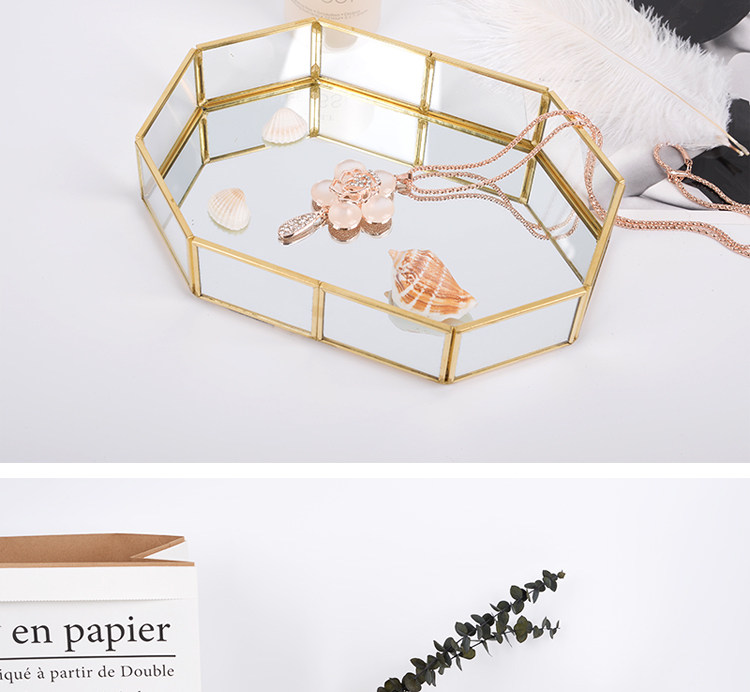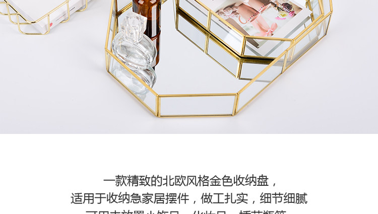 歐式復古銅條玻璃盤首飾收納盤 化妝品盤 擺拍盤裝飾盤桌面擺件1入