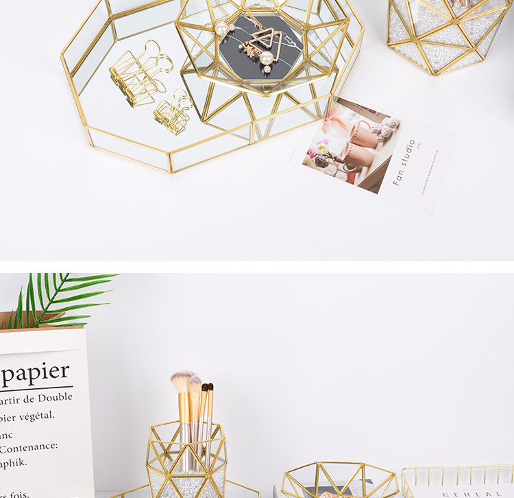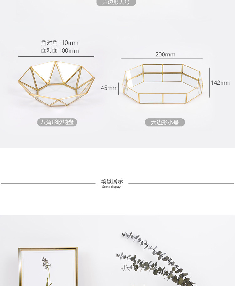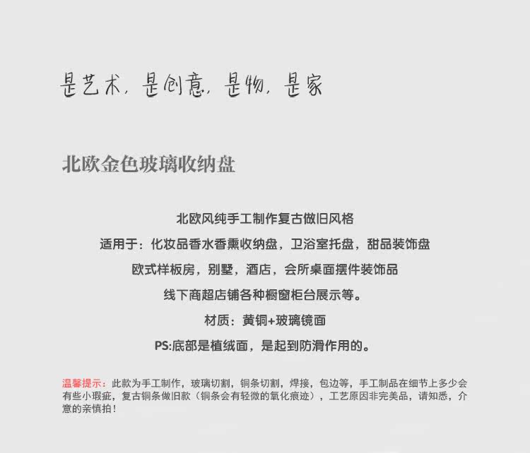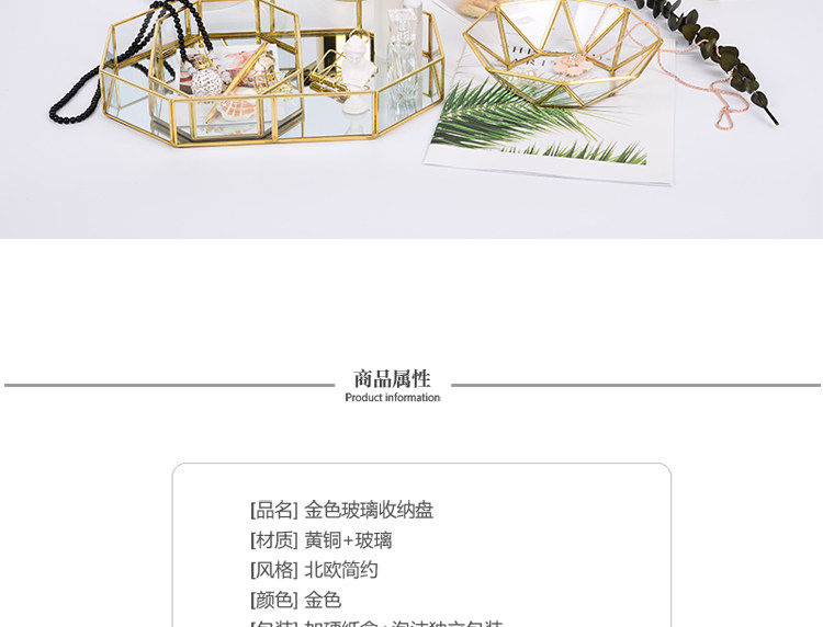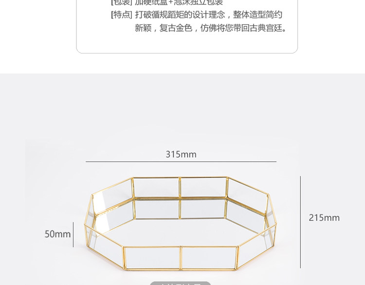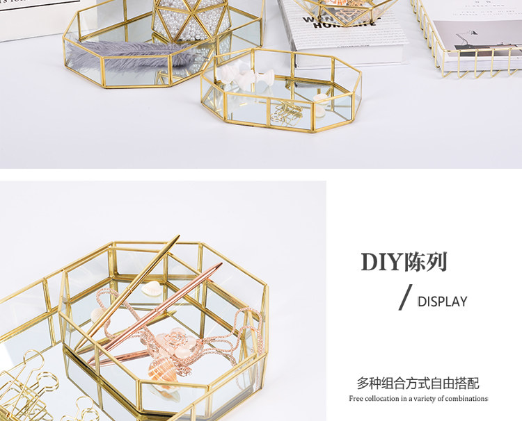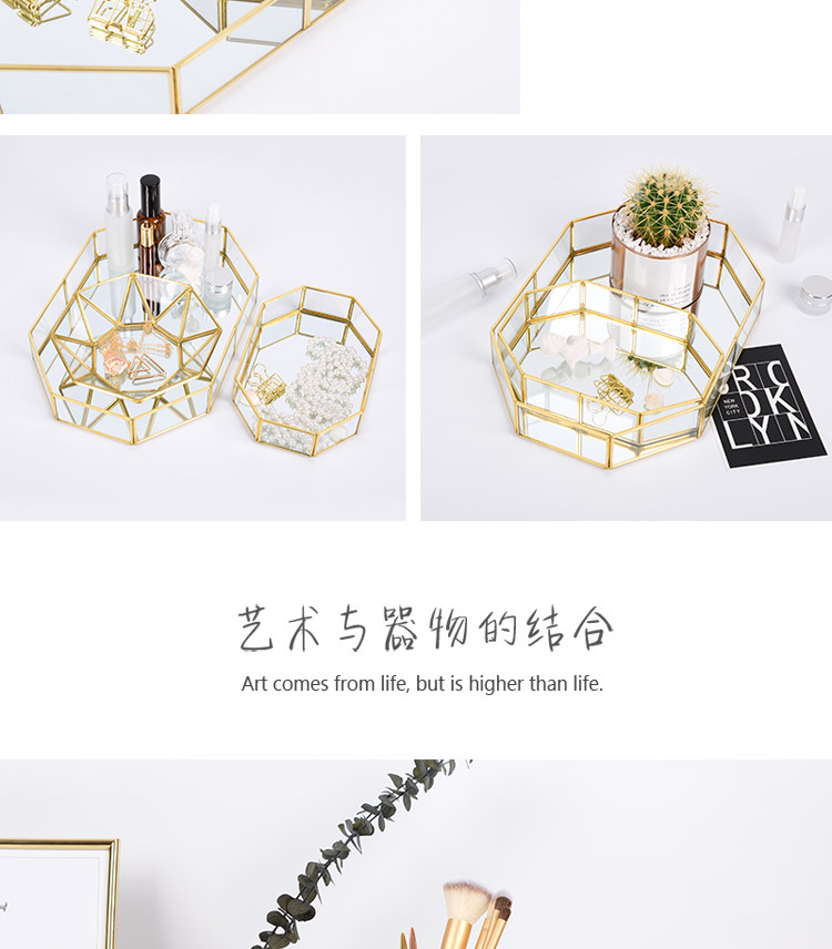 歐式復古銅條玻璃盤首飾收納盤 化妝品盤 擺拍盤裝飾盤桌面擺件1入