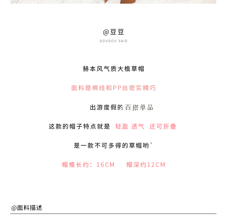 赫本風超大沿沙灘草帽夏季韓版氣質顯臉瘦遮陽帽可折疊出游防曬帽1入
