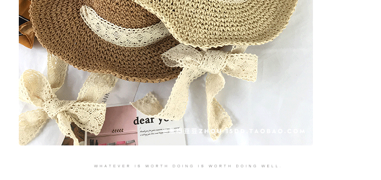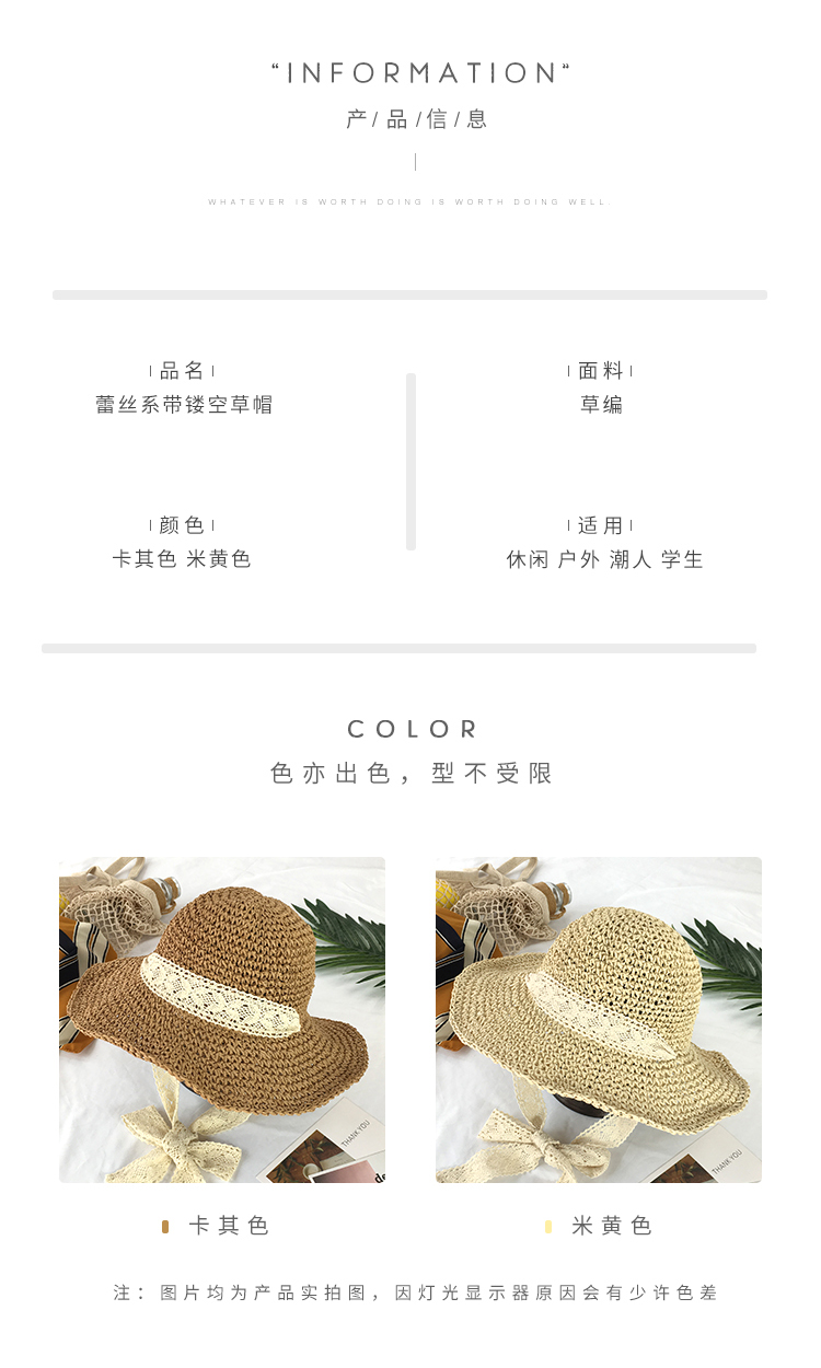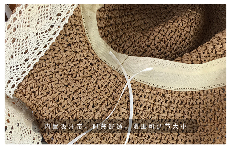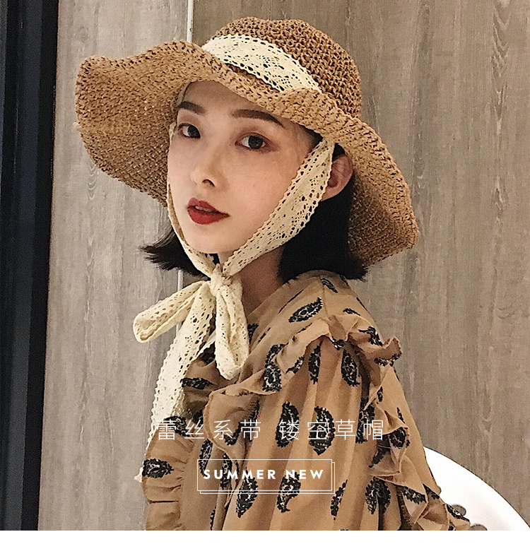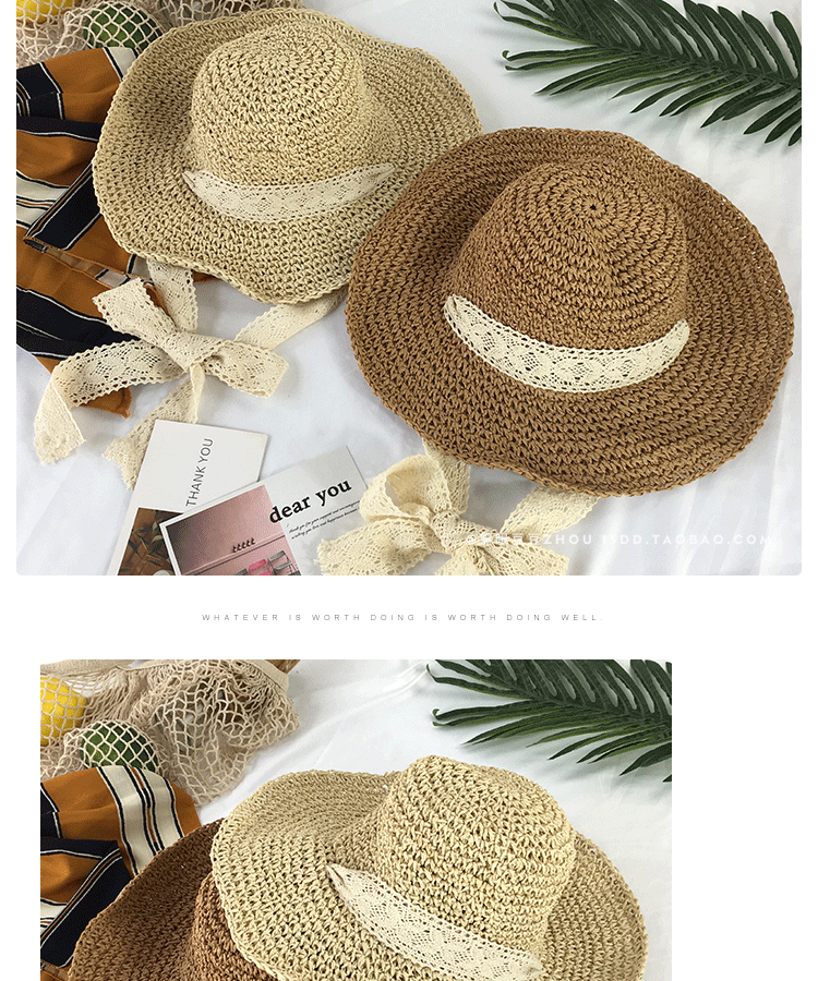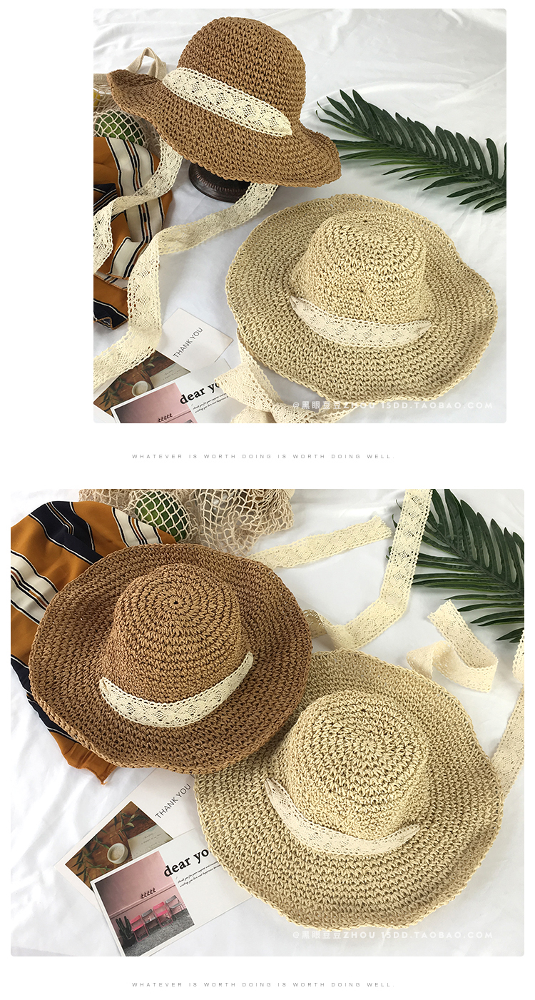 韓版可折疊手工草帽夏蕾絲綁帶大帽檐海邊遮陽帽防曬度假沙灘帽子1入