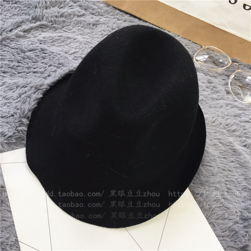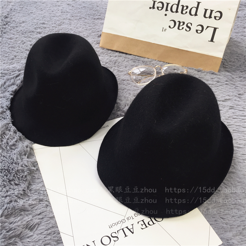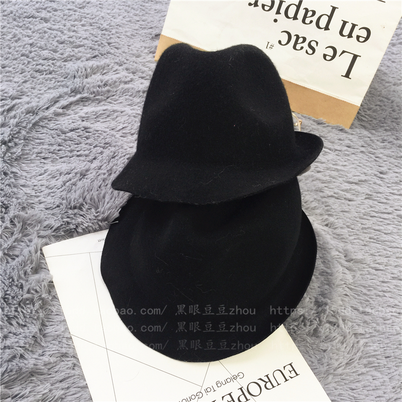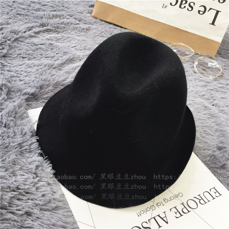 韓版秋冬季卷邊爵士帽羊毛呢小禮帽黑色潮人氈帽英倫復古帽子男女1入