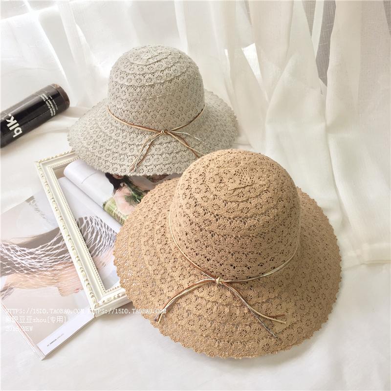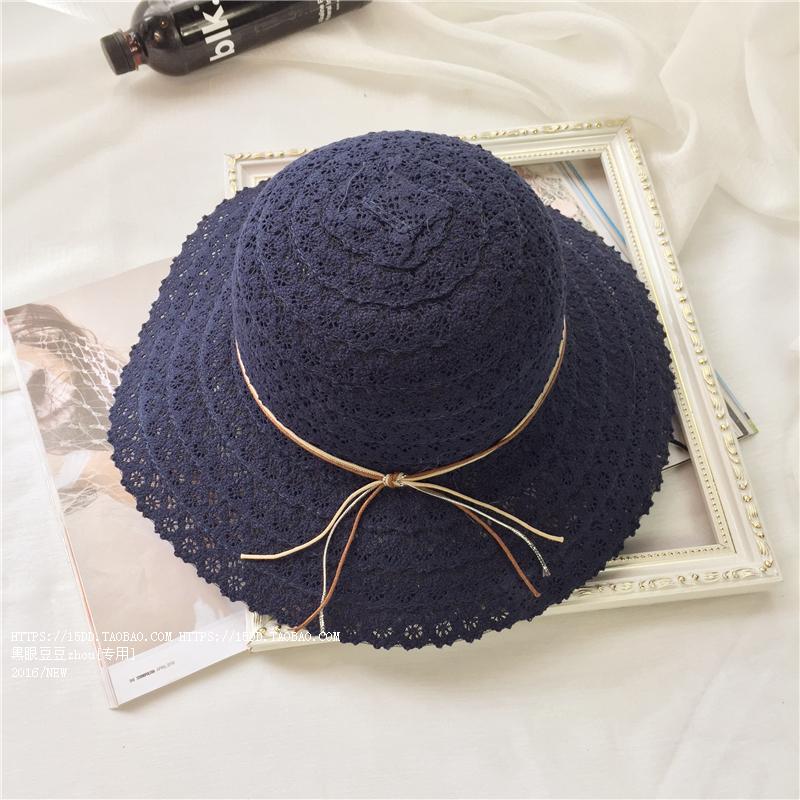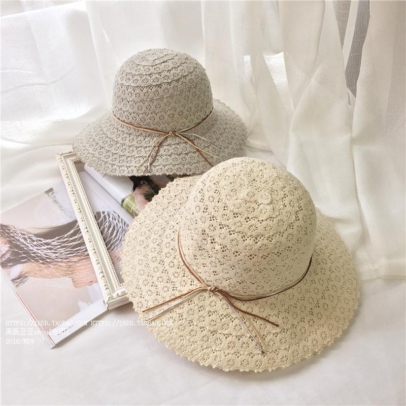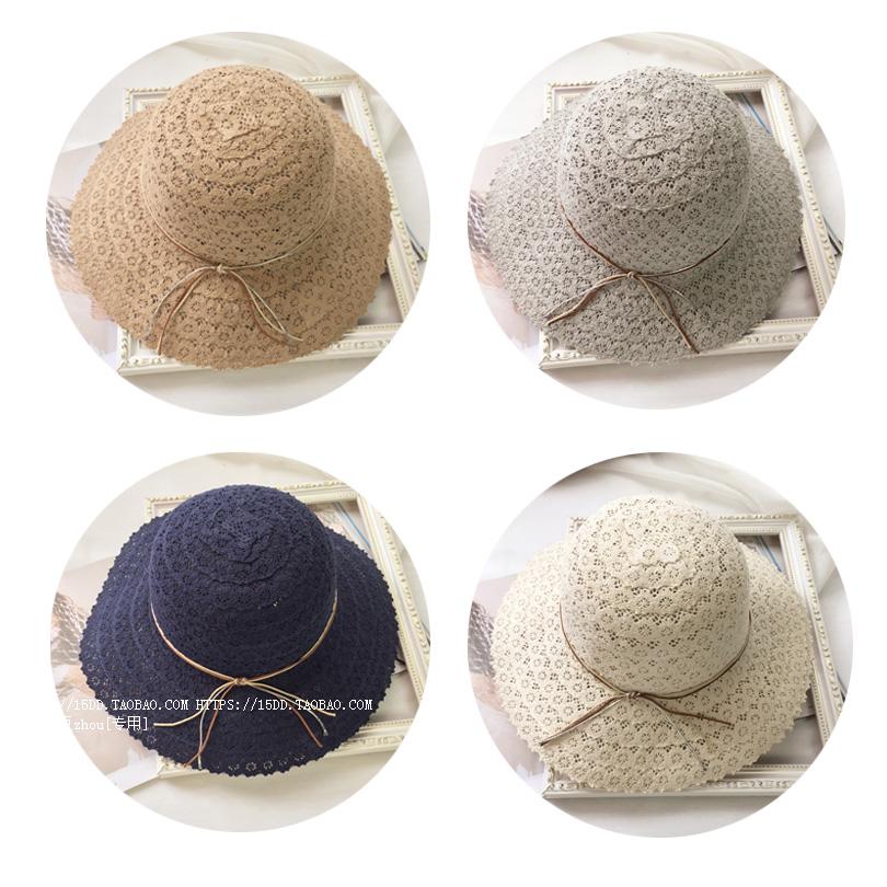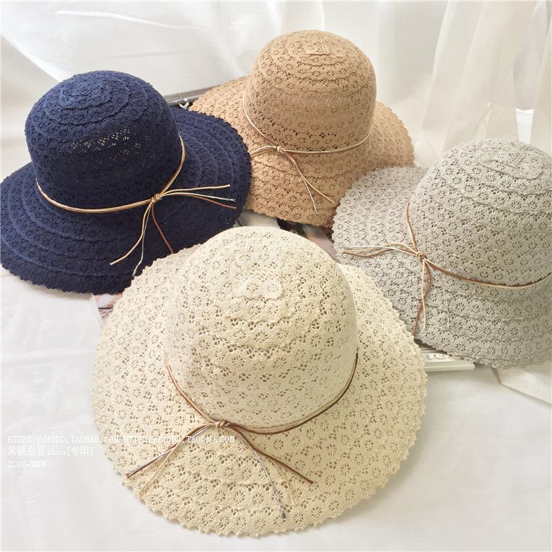 韓版夏季盆帽漁夫帽柔軟可折疊女鏤空蕾絲森系編織草帽圓頂遮陽帽1入