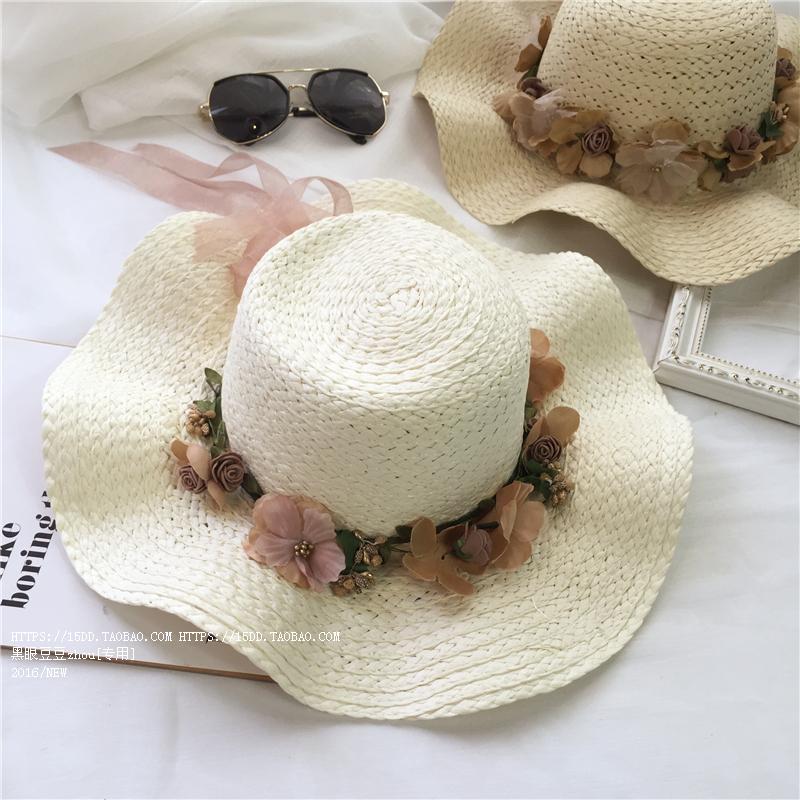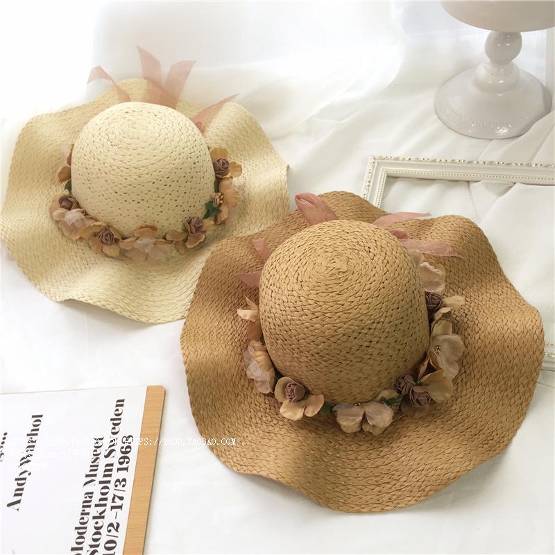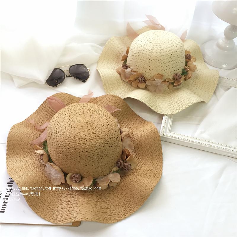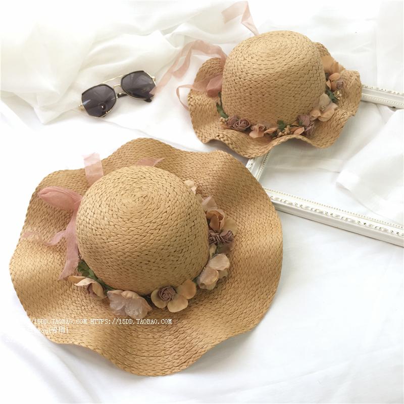 韓版波浪大沿檐花朵草帽親子夏天遮陽帽沙灘涼帽兒童女士太陽帽潮1入