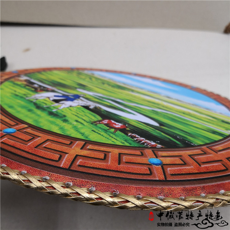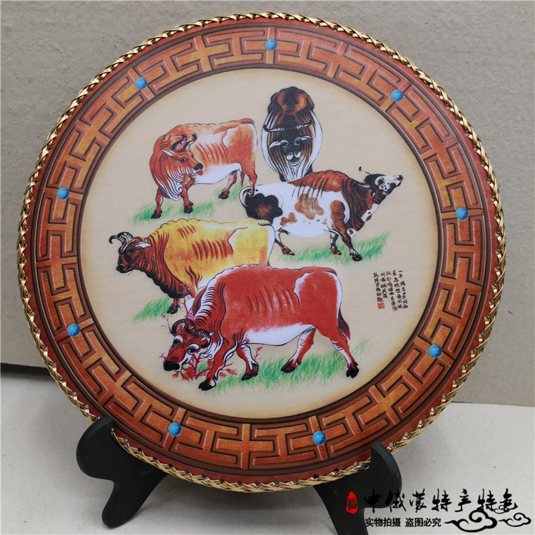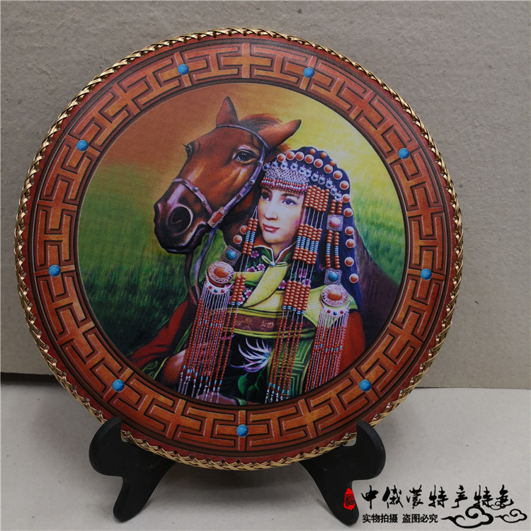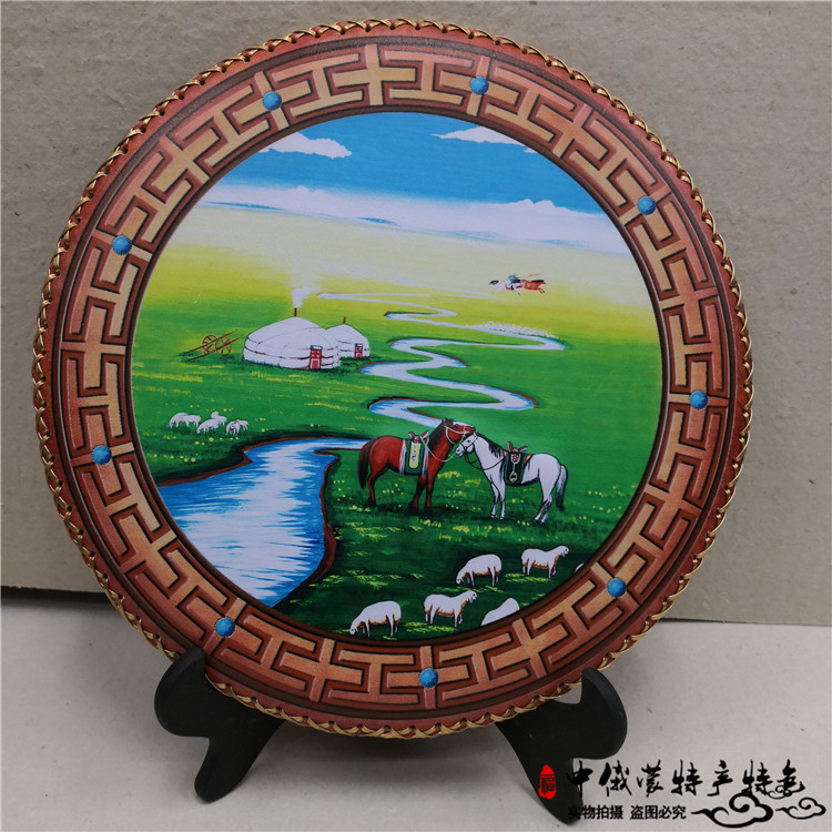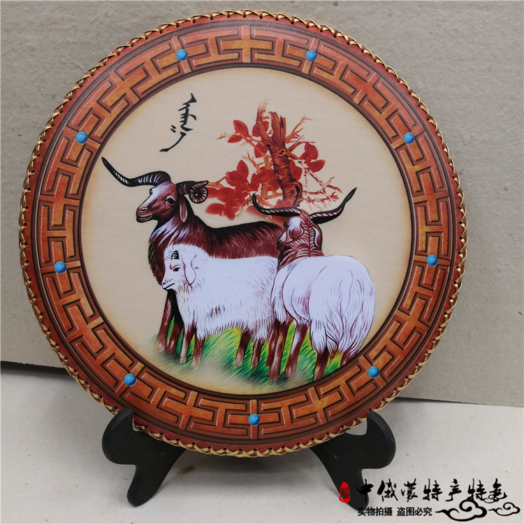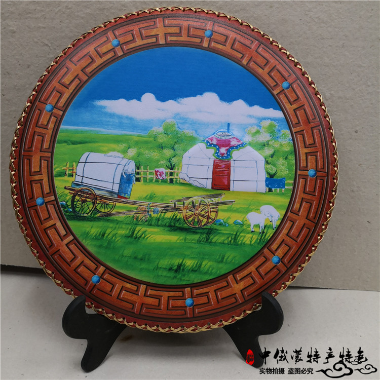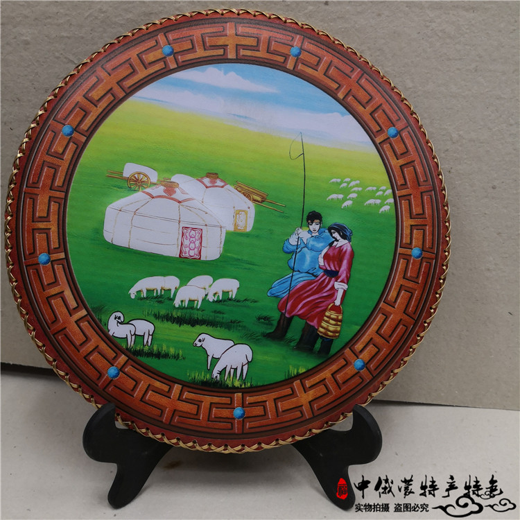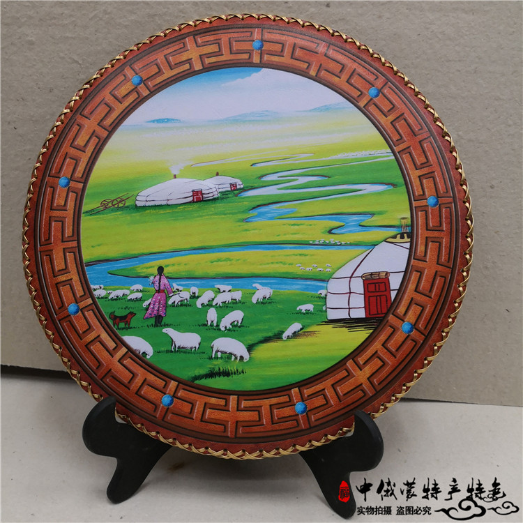 內蒙古皮畫蒙古特色工藝品裝飾畫圓盤擺臺畫家居飾品擺件送禮紀念1入