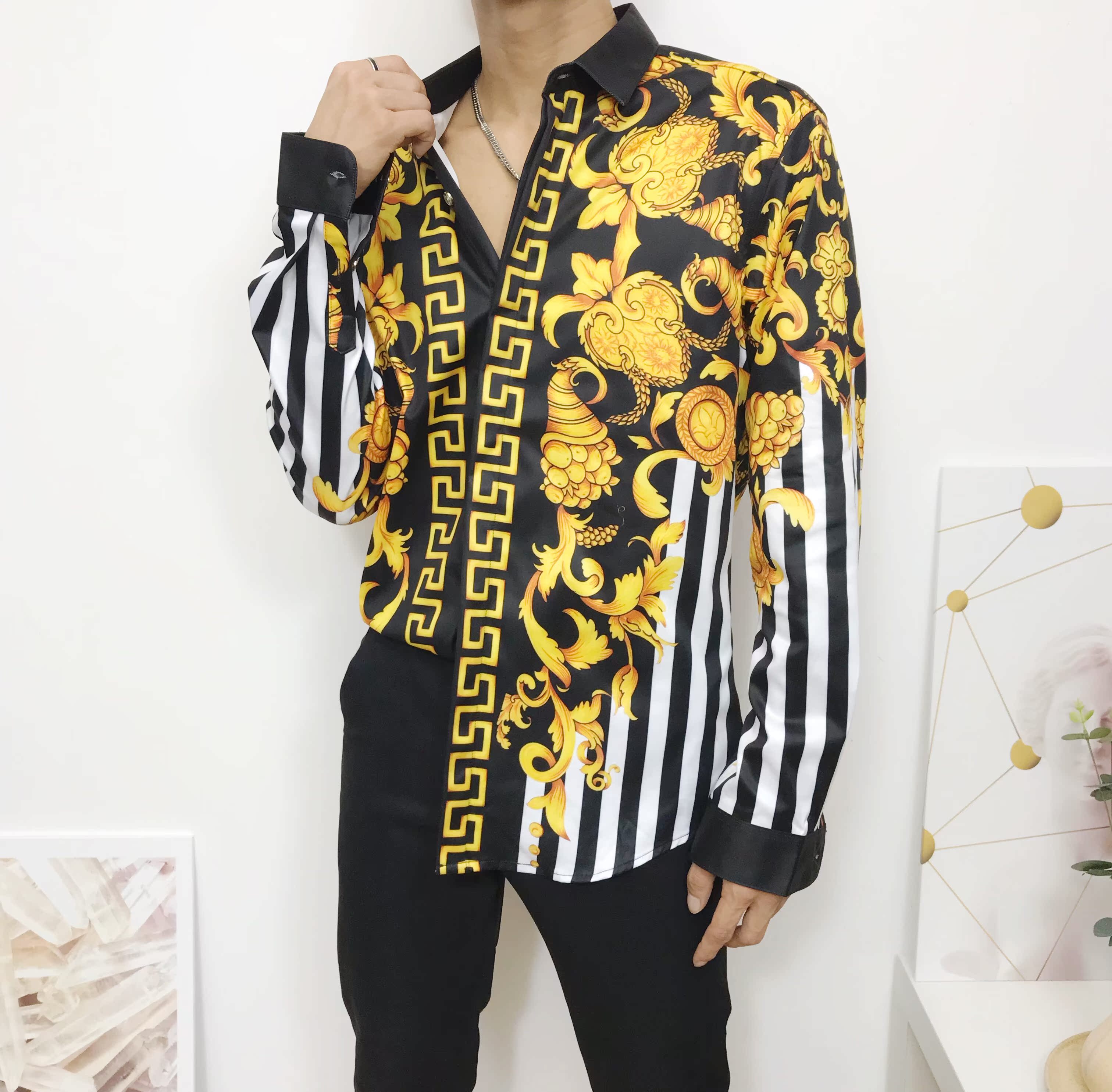 19新款歐美長袖襯衣時尚潮流印花金花創意花紋男女同款情侶寬松襯1入