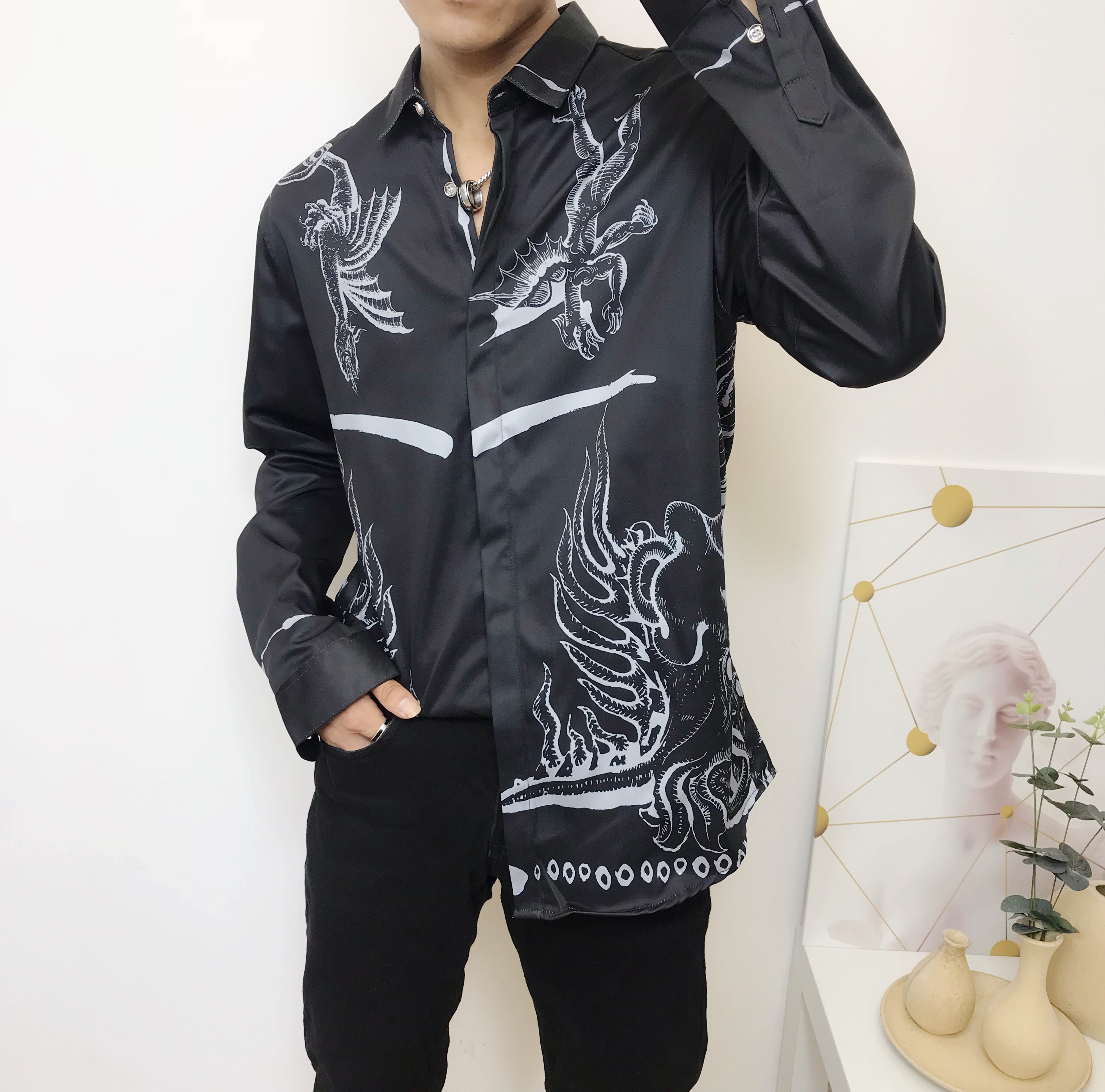 19新款長袖襯衣時尚潮流印花黑色炫酷花紋網紅同款情侶寬松襯衣1入