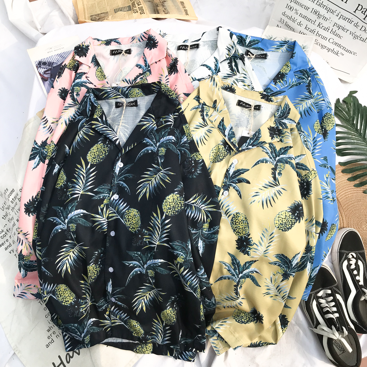 日系夏秋季港風復古襯衫潮流風寬松花色襯衣外套男女情侶款外套1入