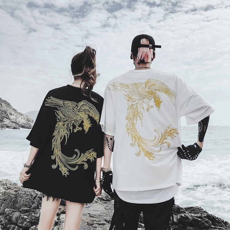 2019夏季新款潮流男女嘻哈時尚原創鳳凰刺繡休閑寬松短袖T恤1入