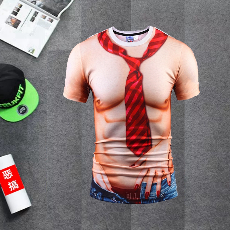 [4]創意搞笑肌肉男t恤3D紋身衣服立體圖案個性假68塊腹胸肌短袖t恤潮1入