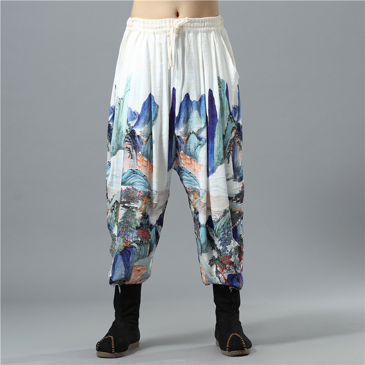 19新款亞麻男裝休閑復古寬松大碼民族風山水印花吊襠褲休閑褲1入