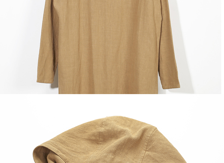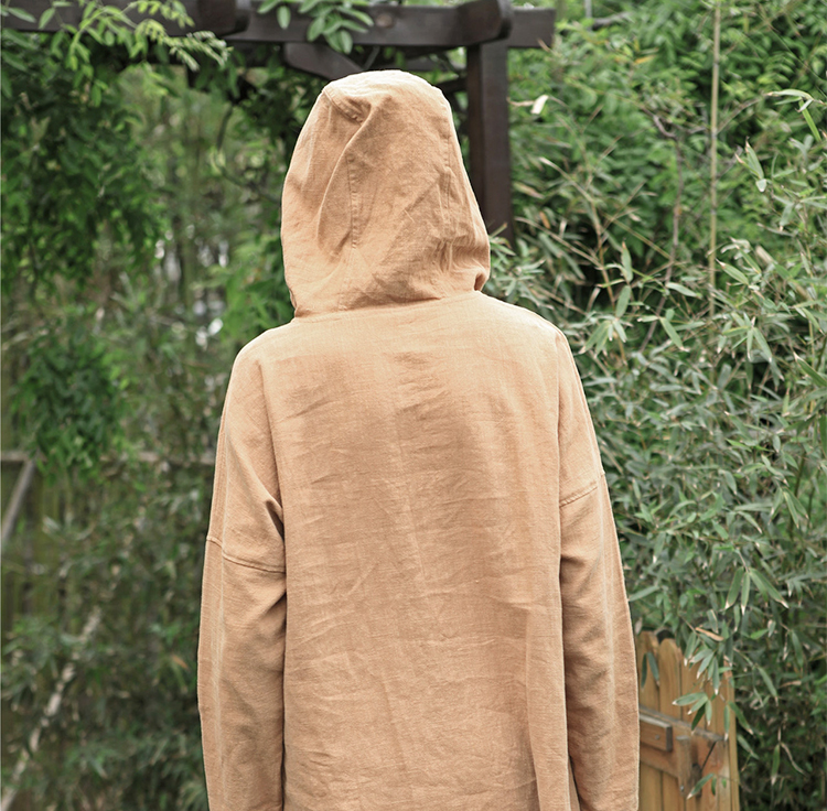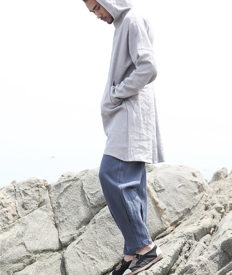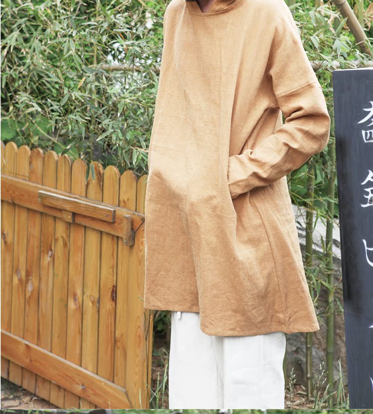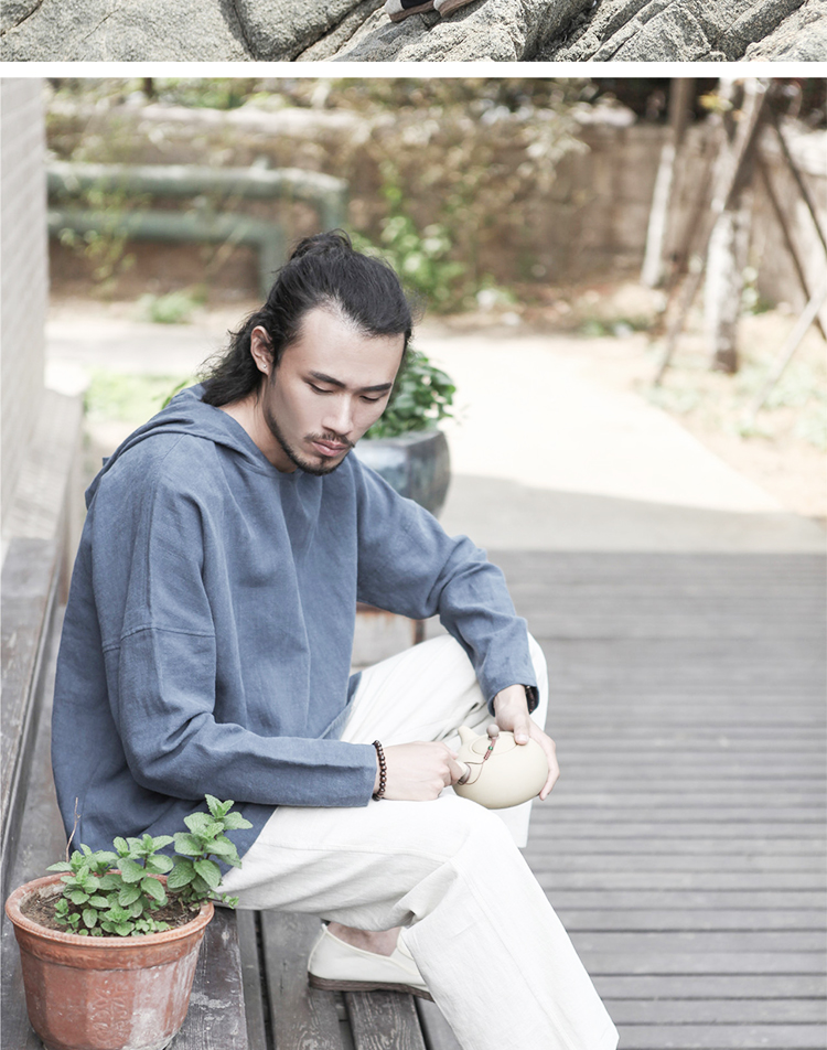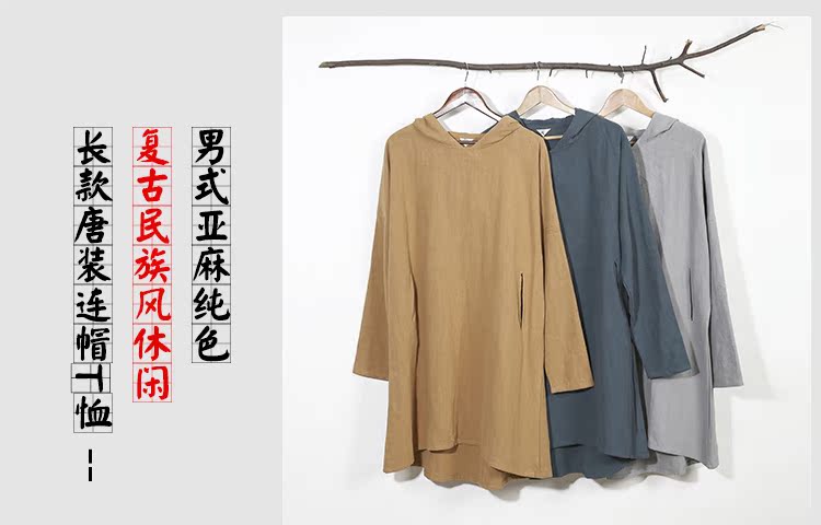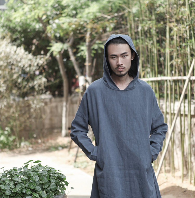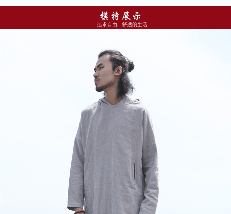 2019秋季新款男式長袖亞麻連帽t恤 純色復古民族風休閑長款唐裝男1入