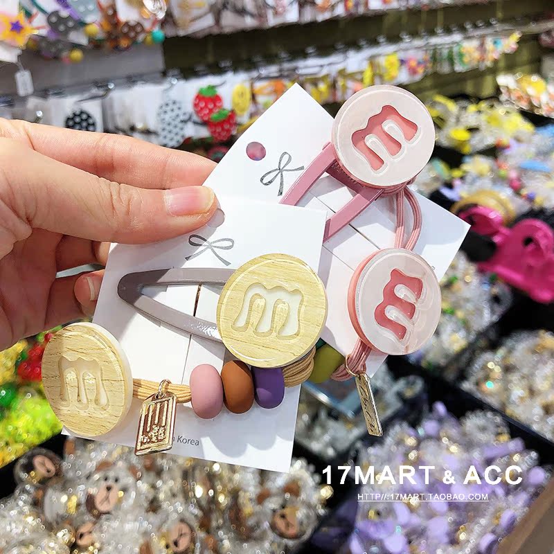 17mart韓國小清新M字母發圈皮筋發繩頭飾扎頭繩發卡邊夾套裝發飾1入