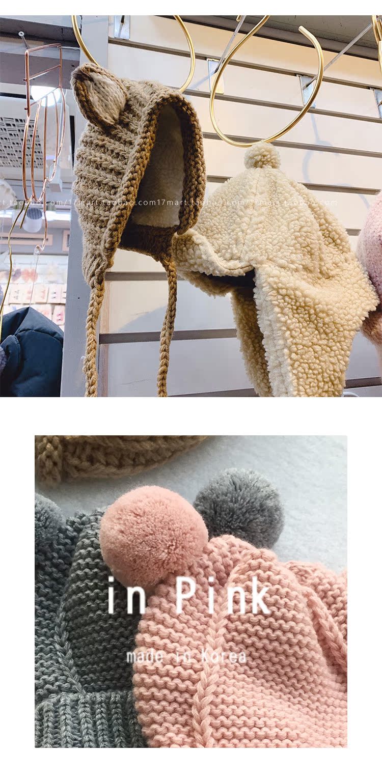韓國進口inpink針織毛線兒童帽子可愛毛球耳朵帽男女童加絨保暖帽1入