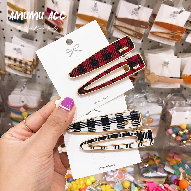 韓國氣質文藝格紋水滴合金鴨嘴夾邊夾套裝百搭甜美發夾劉海夾1入