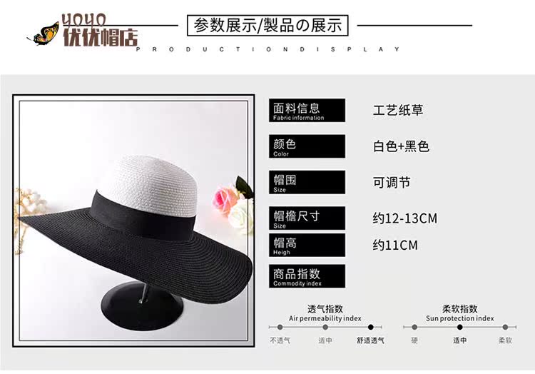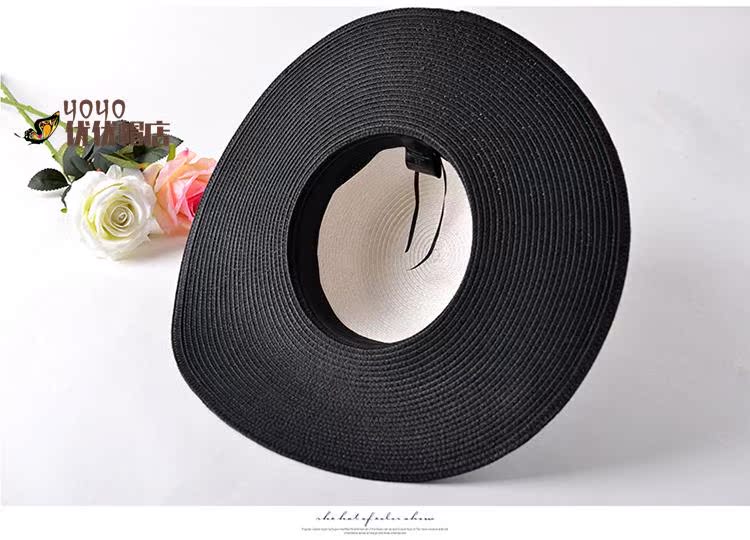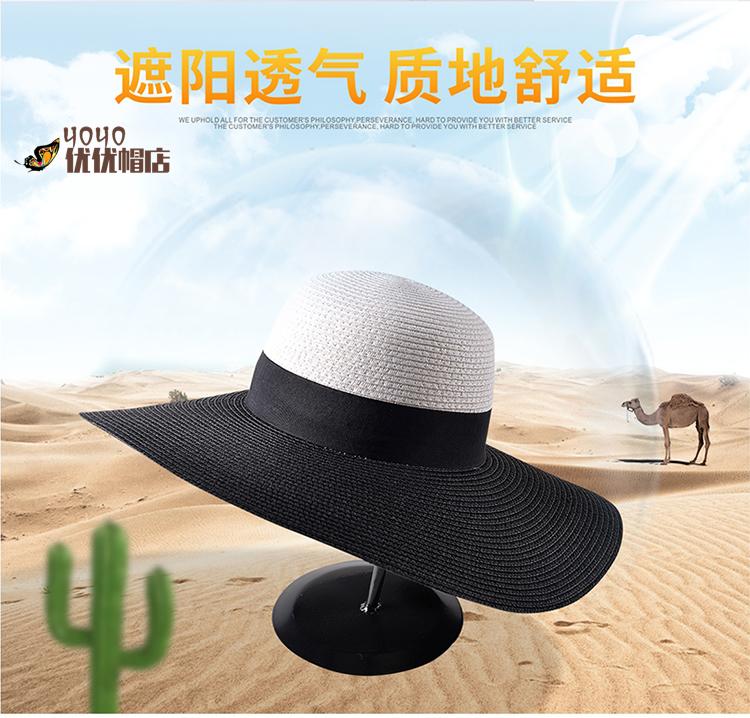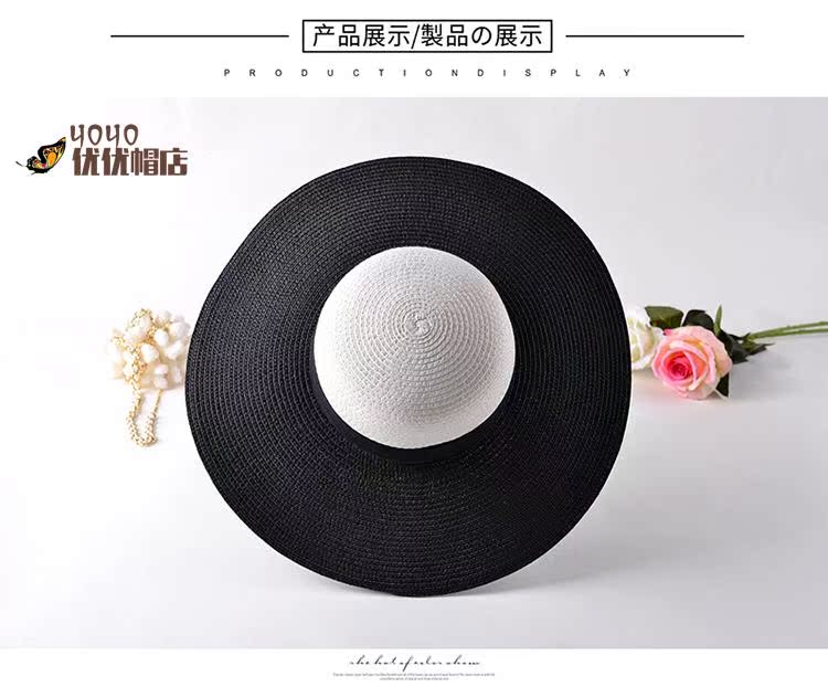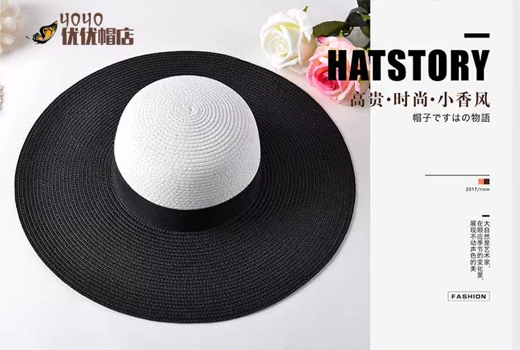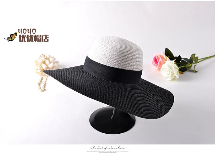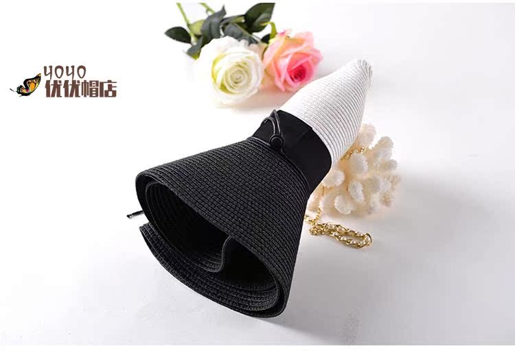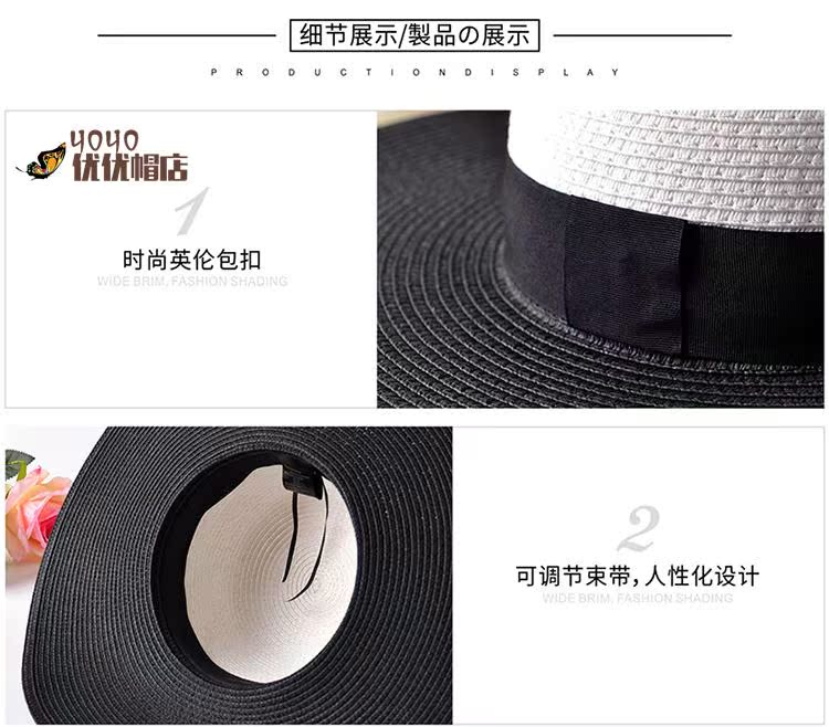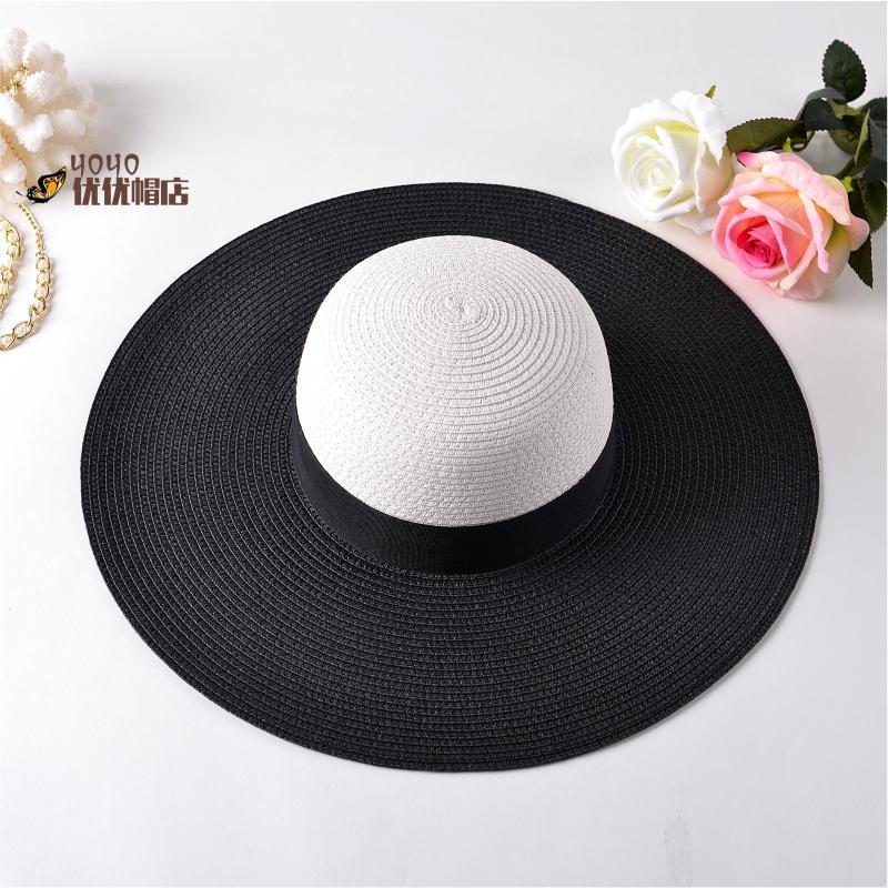 黑白拼接大檐帽圓頂草帽女夏天防曬遮陽沙灘帽海邊出游大沿帽子潮1入