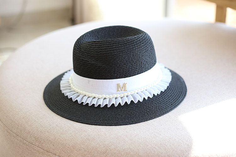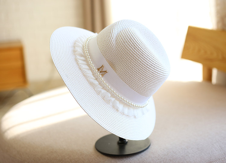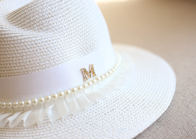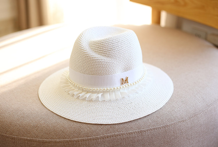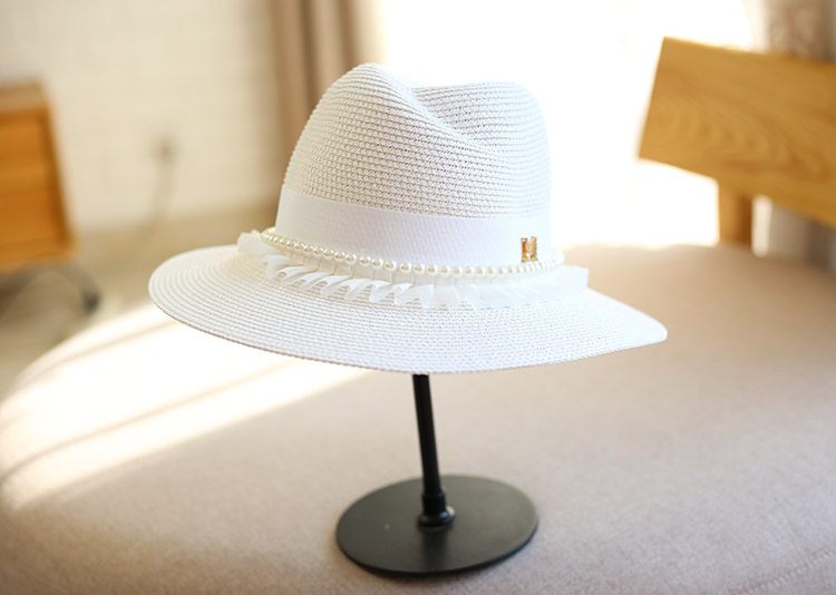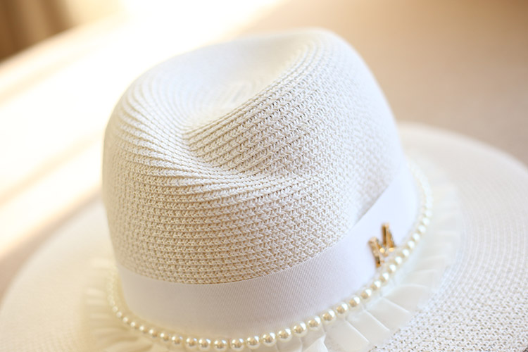 韓版白色珍珠爵士帽寬檐禮帽草編白色蕾絲珍珠草帽子女草帽遮陽1入