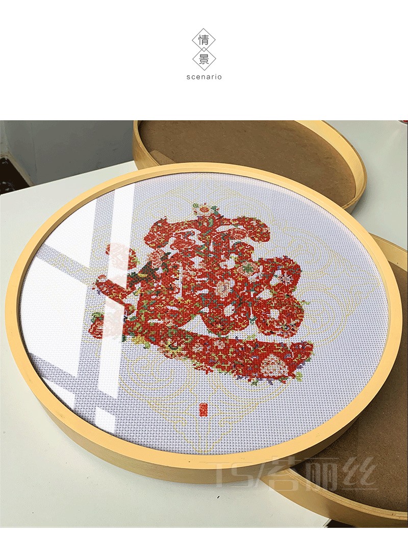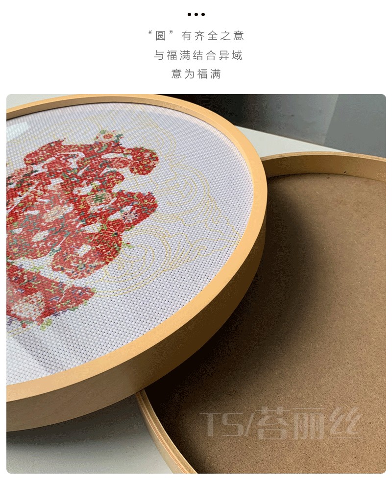 招財進寶十字繡圓形繡圖帶框畫現代簡約客廳3d印花線繡絲線帶玻璃1入