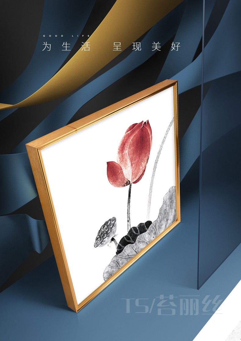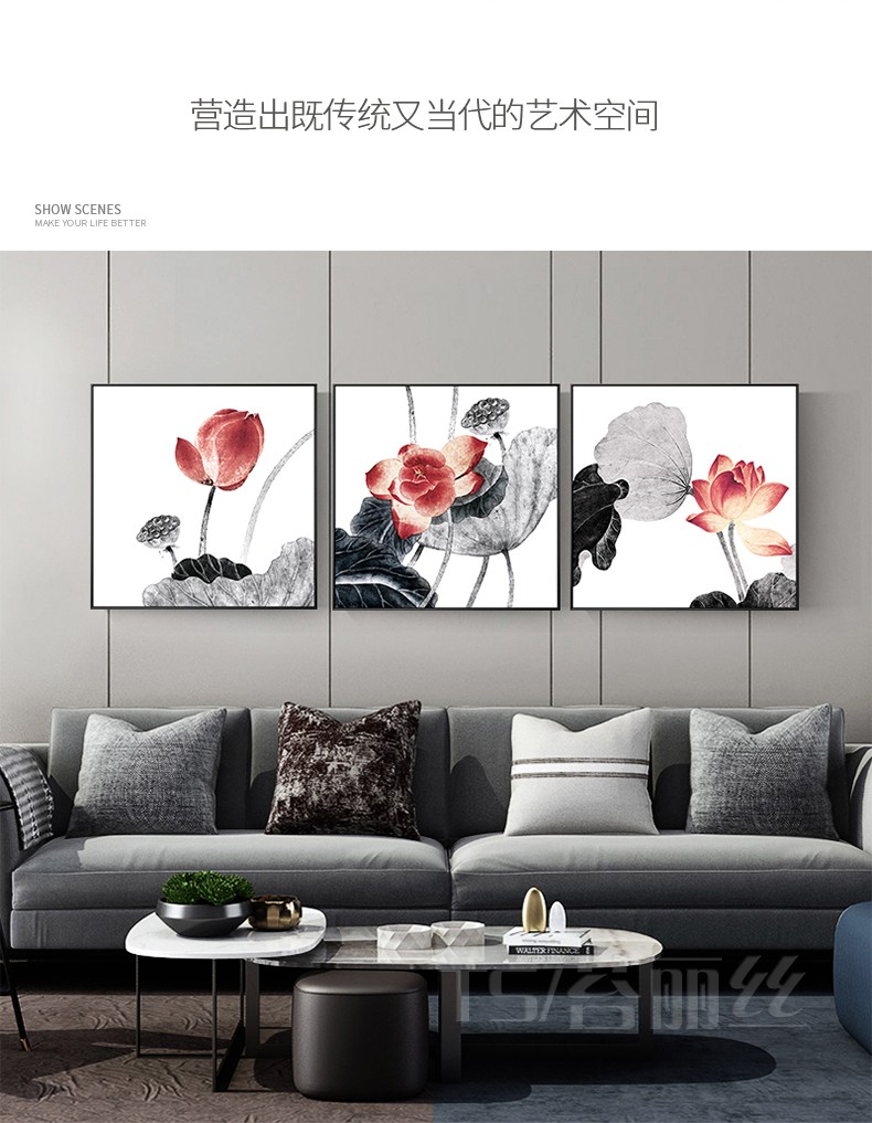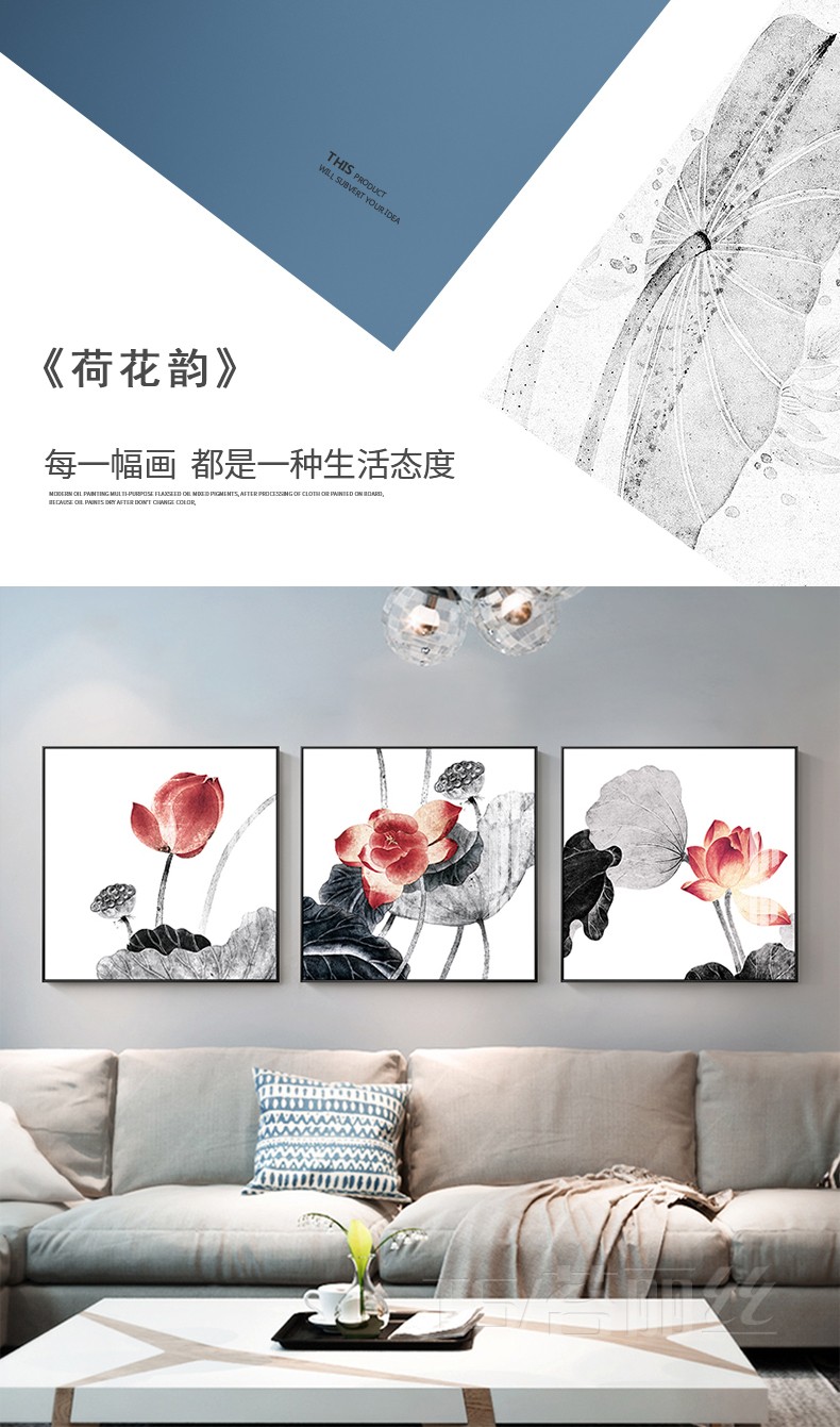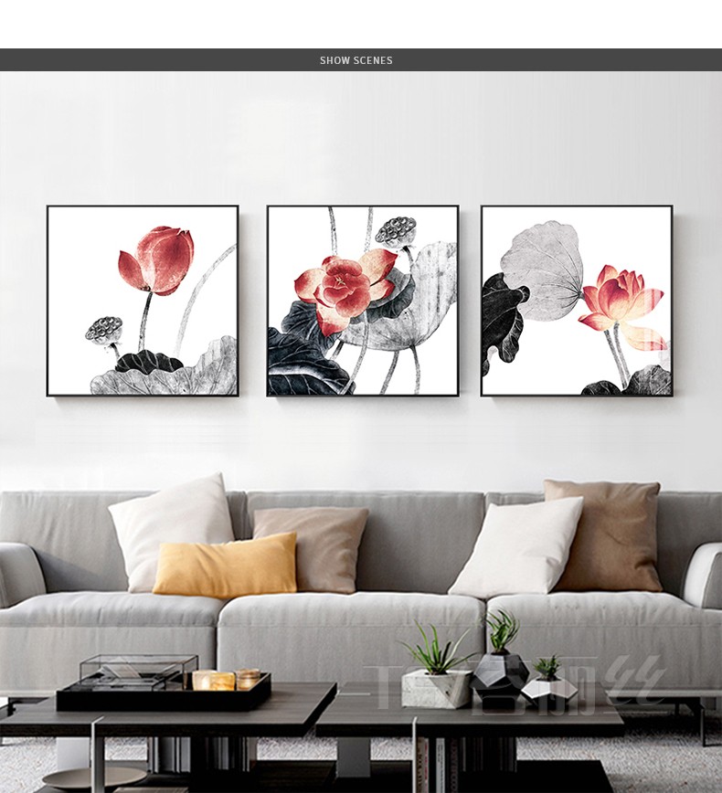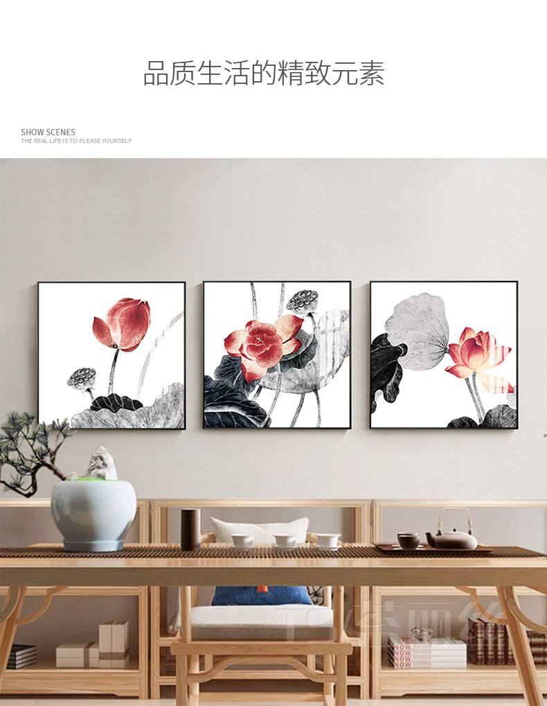 鉆石畫三聯畫新中式貼鉆十字繡水墨荷花雅韻茶室鉆石繡現代磚石畫1入