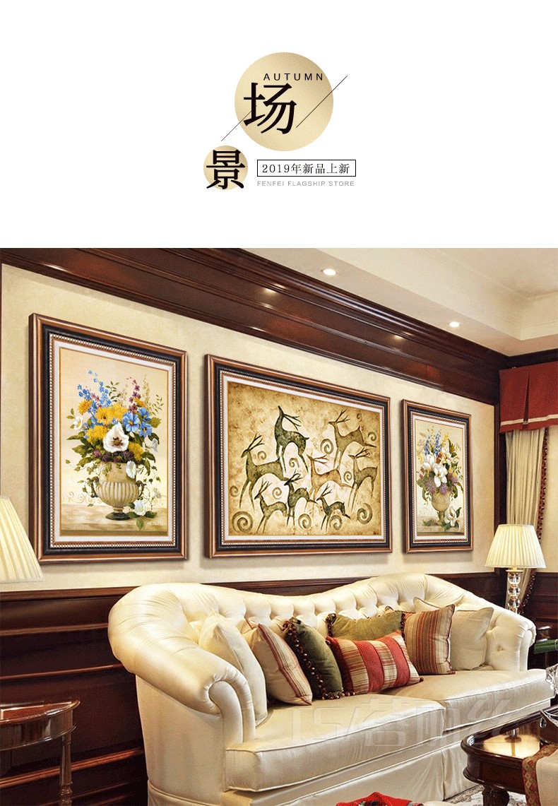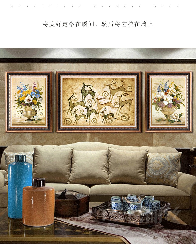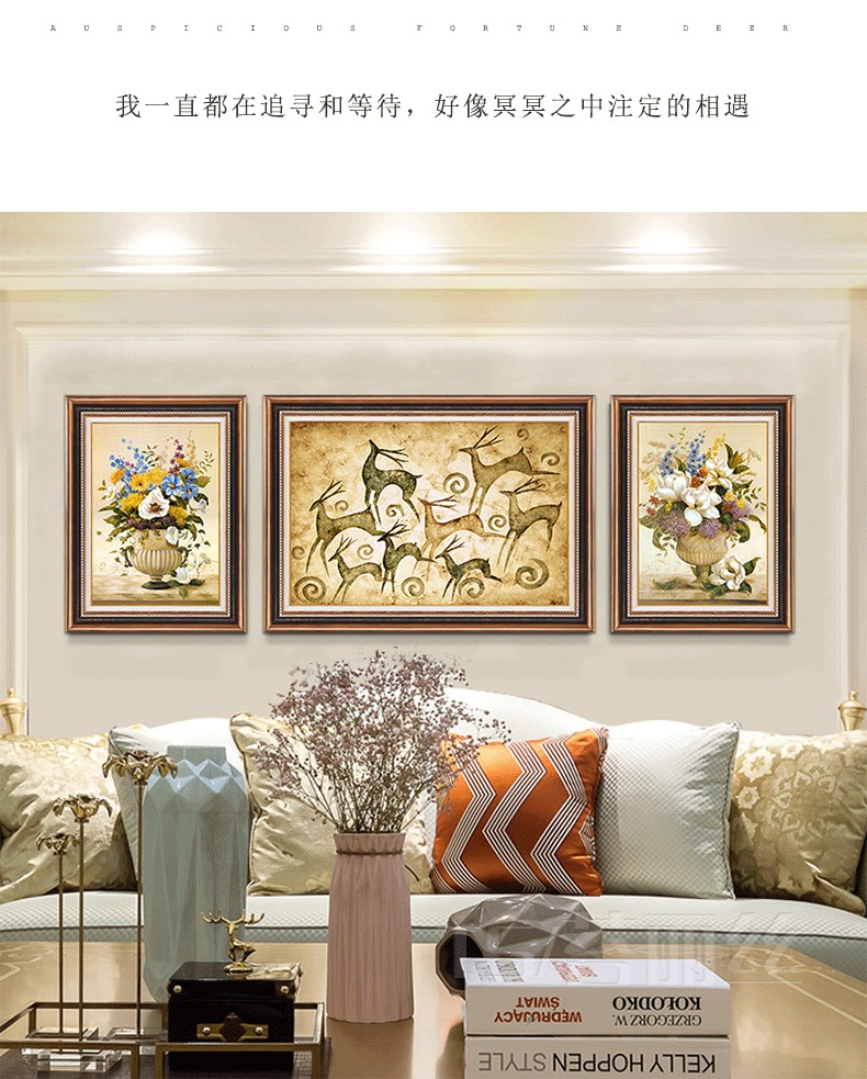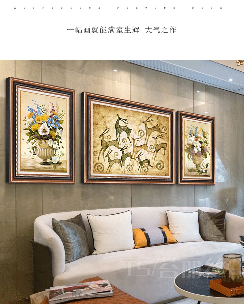 富貴發財鹿十字繡2019新繡客廳家用歐式三聯畫線繡滿繡麋鹿全繡線1入
