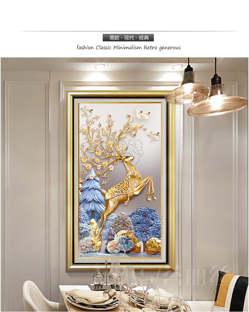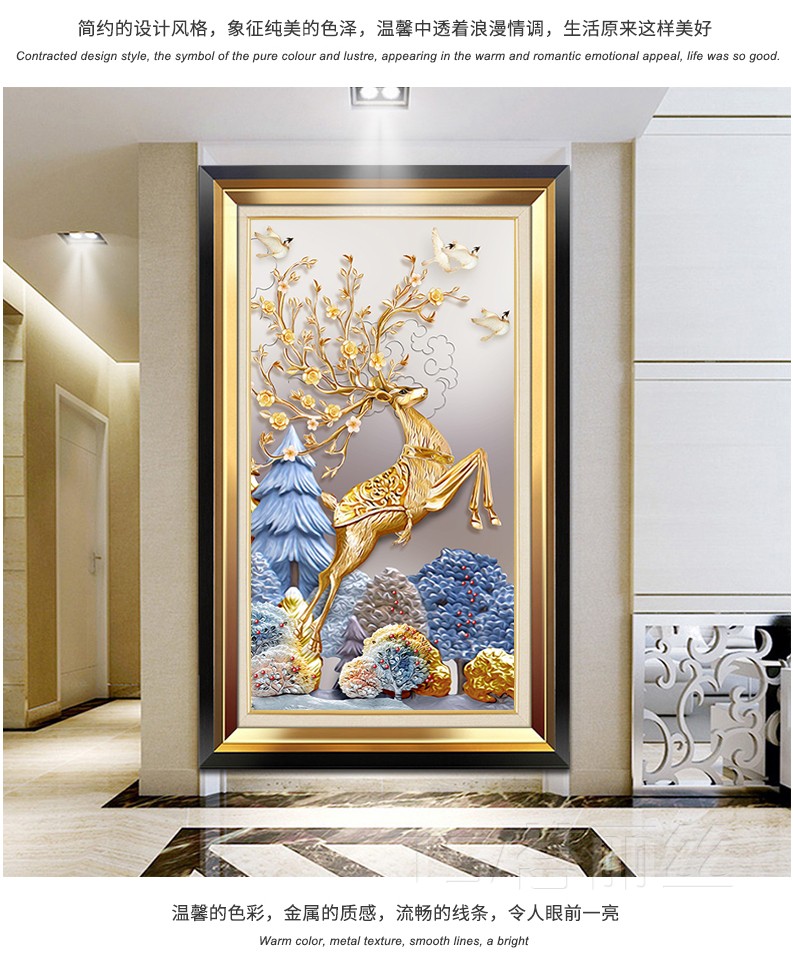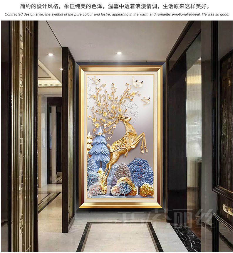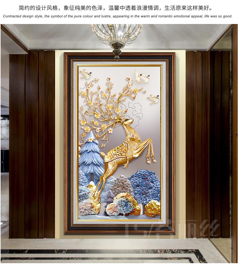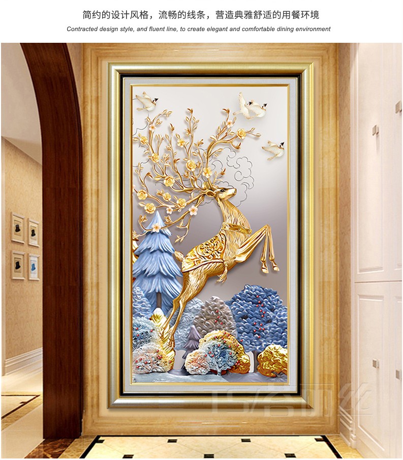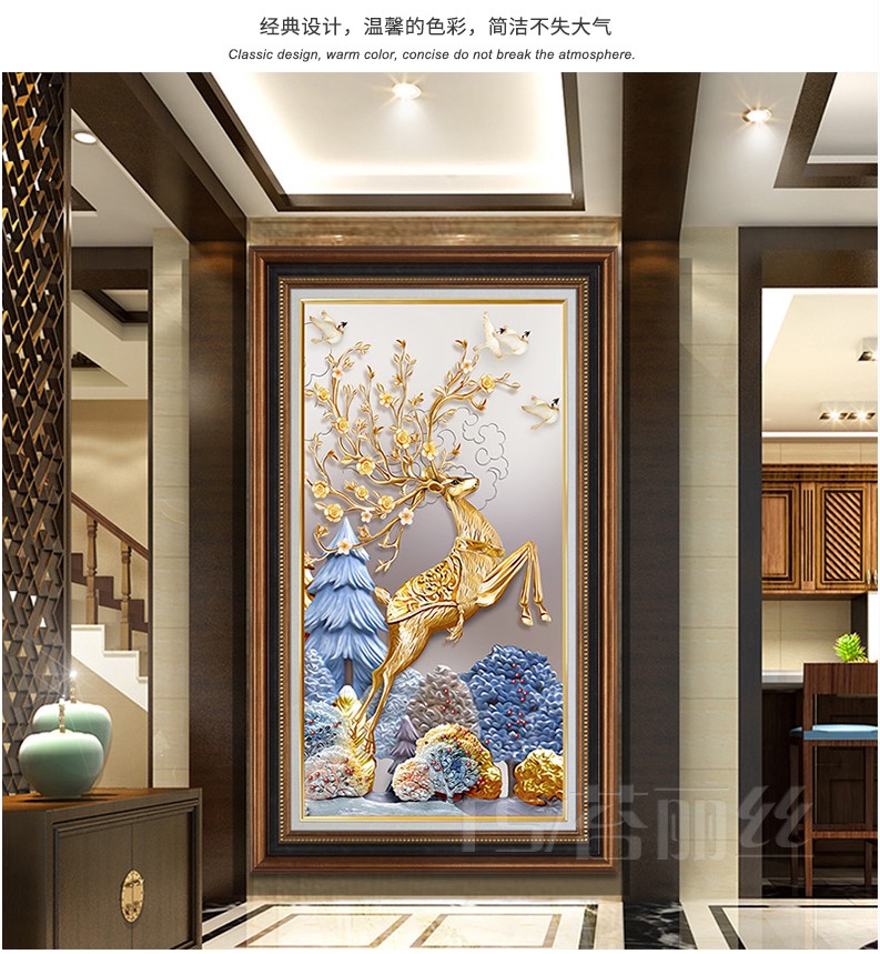 歐式輕奢豎版進門發財鹿十字繡線繡滿繡棉線麋鹿現代客廳玄關刺繡1入