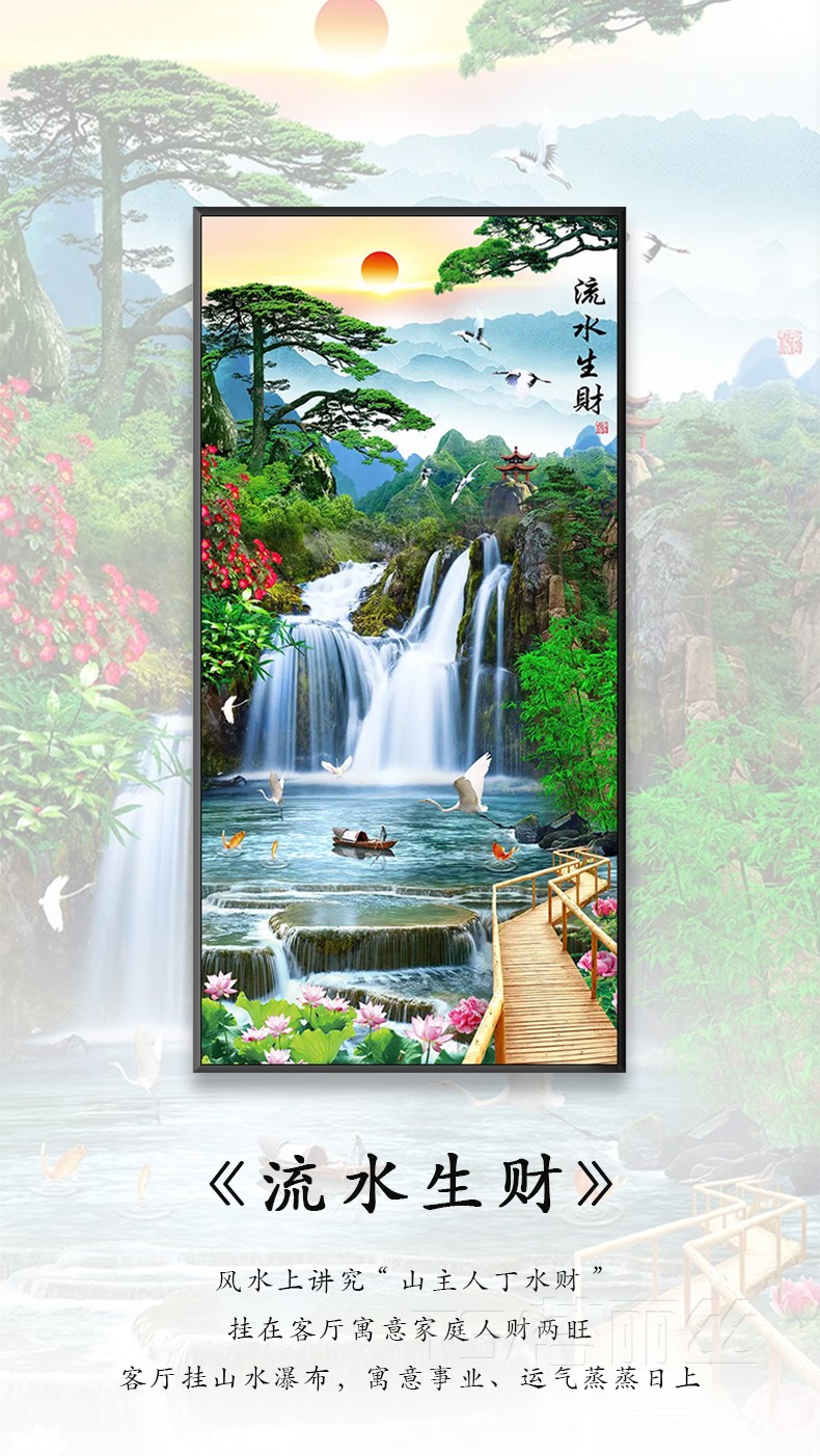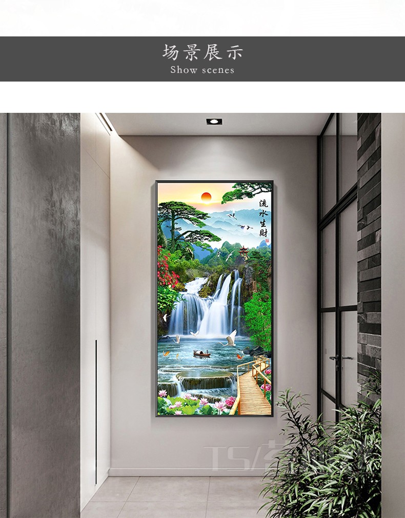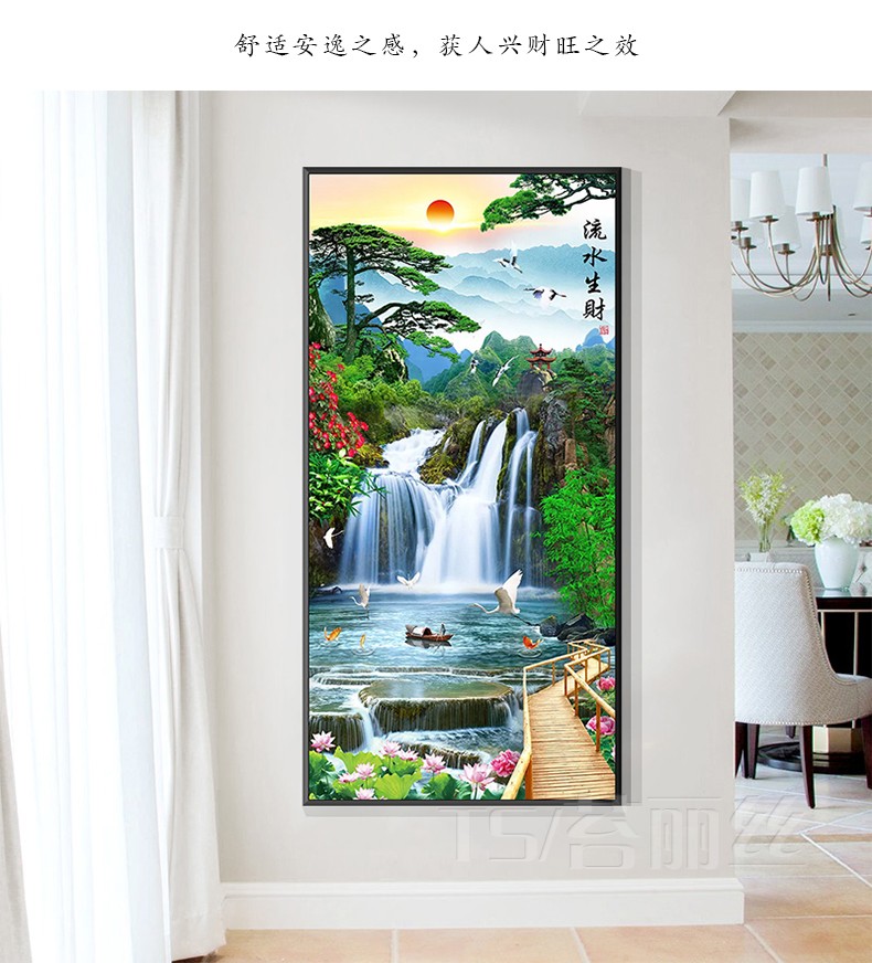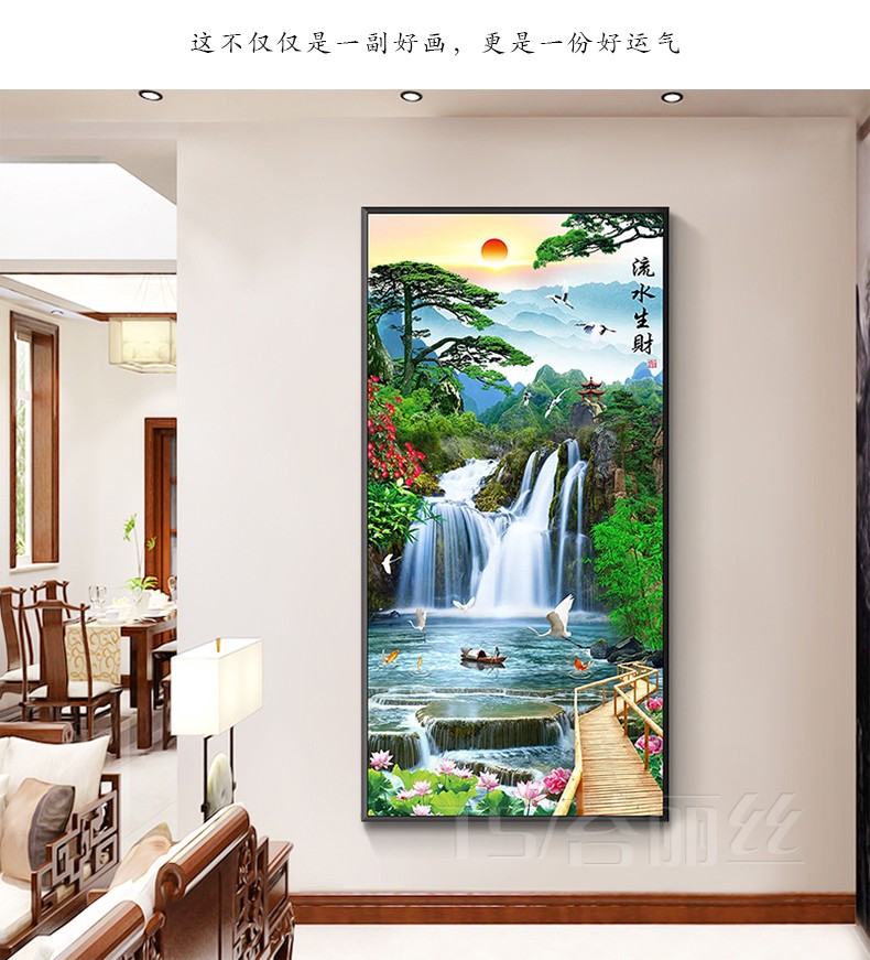 十字繡線繡流水生財滿繡山水畫新款客廳玄關豎版現代風景聚寶盆畫1入