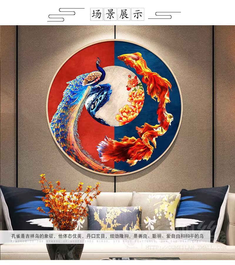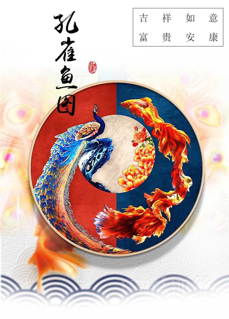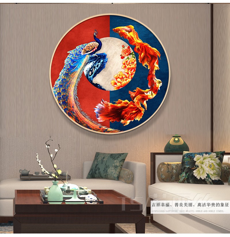 十字繡小件簡單繡古風鳳凰孔雀魚古典客廳玄關吉祥如意圓形刺繡版1入